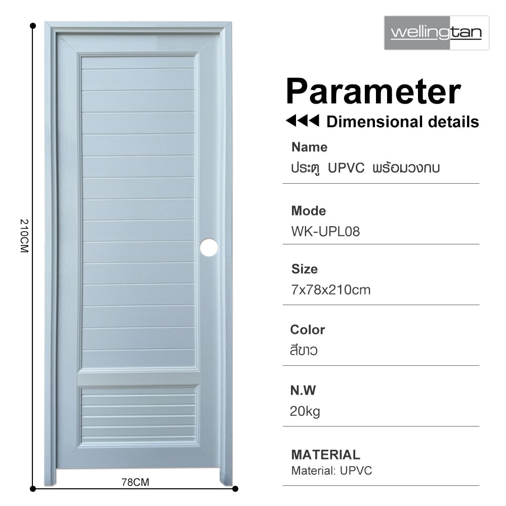 ประตู UPVC (Unplasitcized Polyvinyl Chloride) พร้อมชุดวงกบจากแบรนด์Wellingtan มีคุณสมบัติทนต่อความชื้น ไม่บวมน้ำ โครงสร้างประตูแข็งแรงทนทาน เป็นวัสดุฉนวนกันความร้อน หมดปัญหาเรื่องปลวกและแมลงกัดกิน ออกแบบมาเพื่อทดแทนการใช้ประตูไม้จริง ผ่านเทคโนโลยีการผลิตที่อันทันสมัย เหมาะสำหรับใช้ติดตั้งเป็นประตูภายในบ้าน