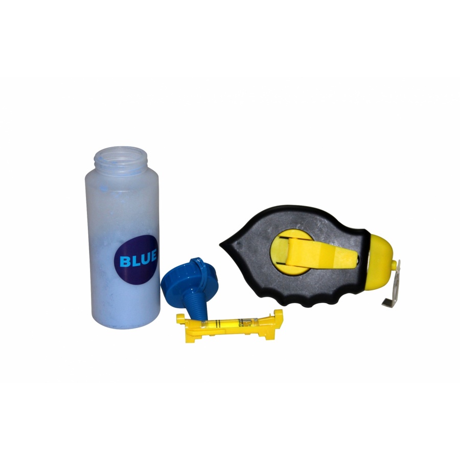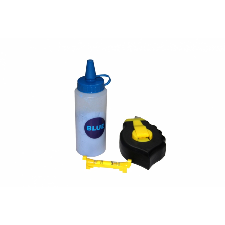 อุปกรณ์เครื่องมือช่างสำหรับตีเส้นแบ่งแนวเขต : ปักเต้าตีเส้น 30 เมตร พร้อมผงชอล์กสีน้ำเงิน ขนาด 115 กรัม และระดับน้ำขนาดเล็ก ครบ จบ ในแพ็คเกจเดียว