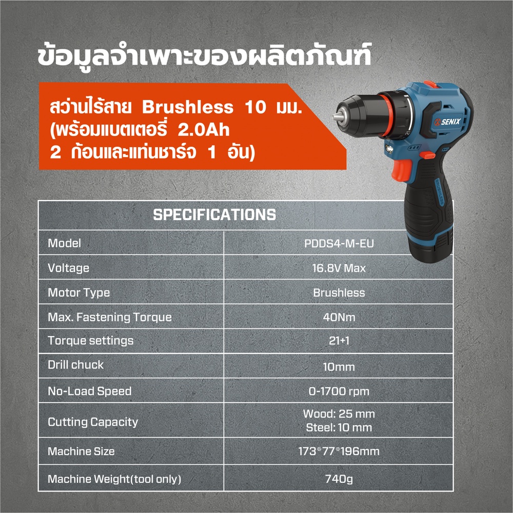 ขนาดหัวจับดอกสว่าน : รองรับขนาดดอกสว่านสูงสุด 10 มม.