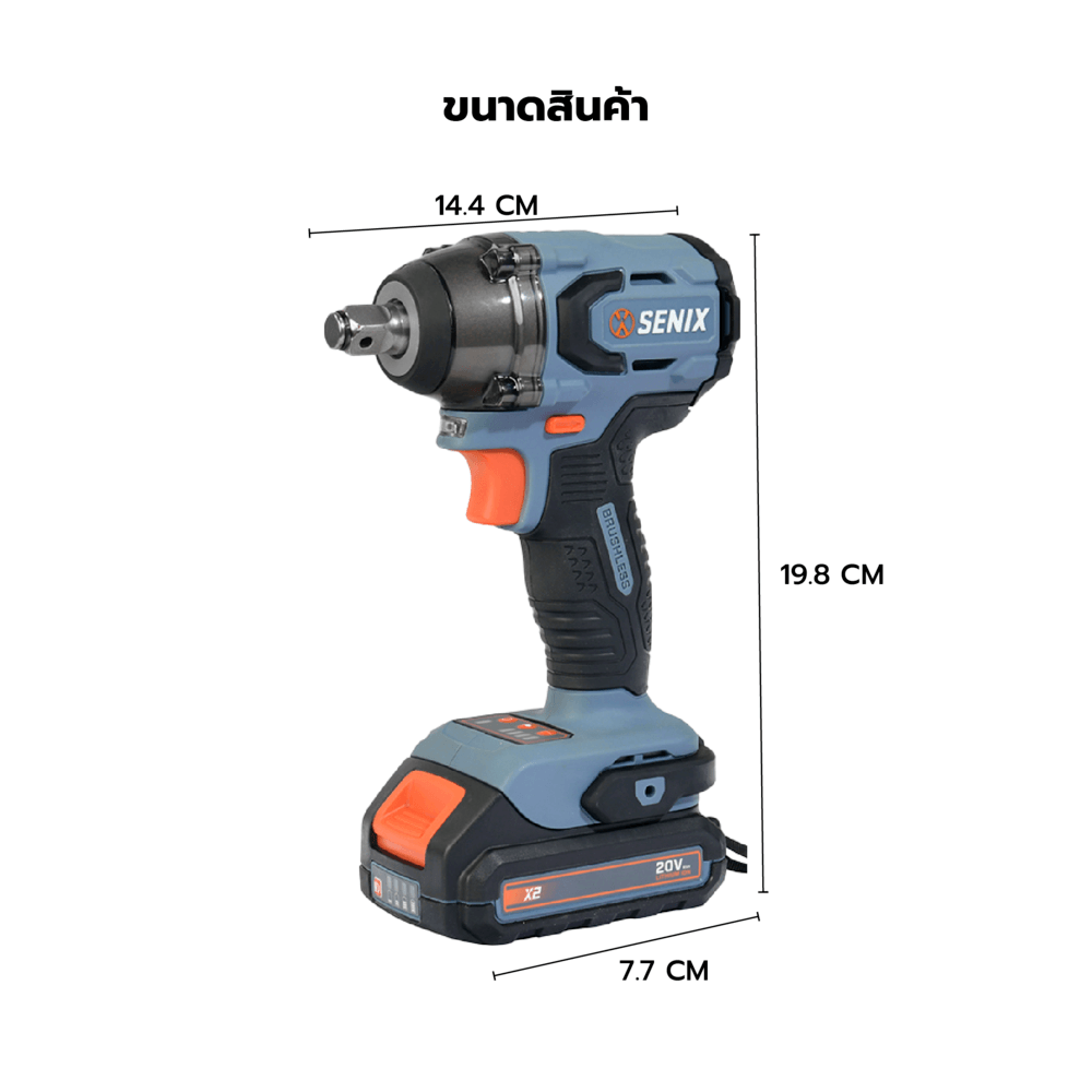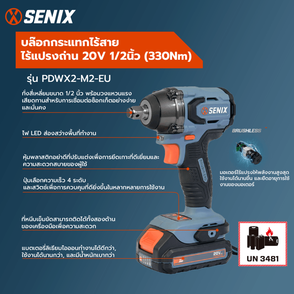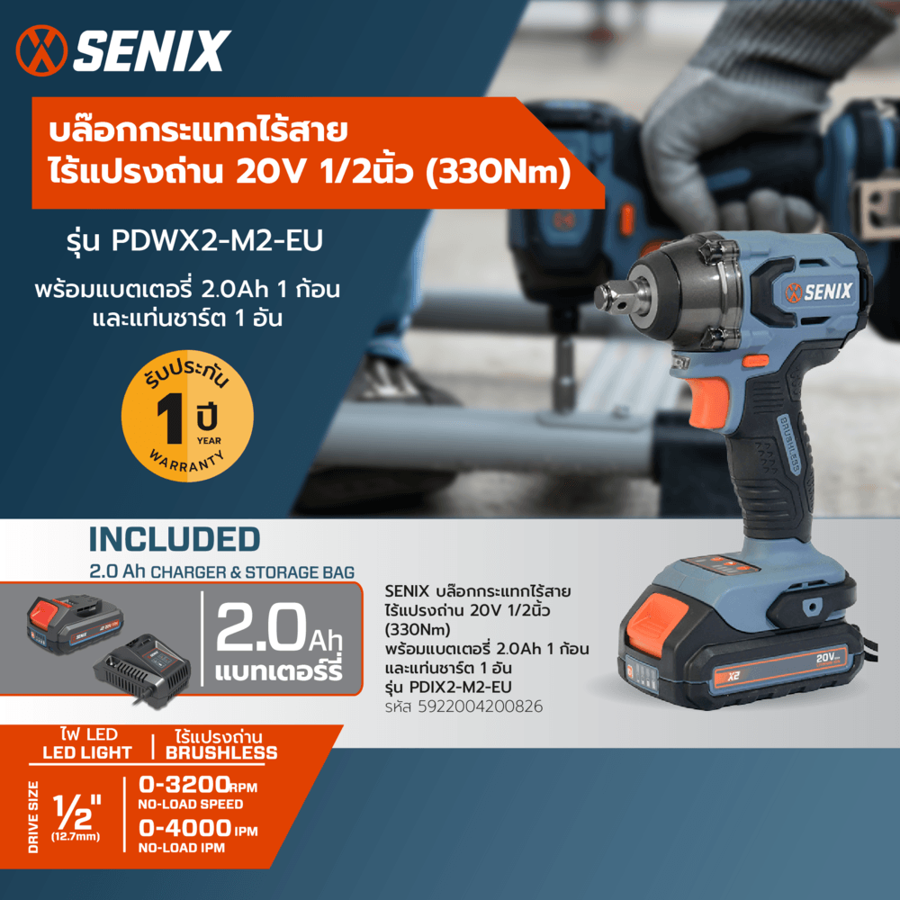 SENIX บล๊อกกระแทกไร้สาย ไร้แปรงถ่าน 20V 1/2นิ้ว (330Nm) รุ่น PDWX2-M2-EU พร้อมแบตเตอรี่ 2.0Ah 1ก้อน และแท่นชาร์ต1อัน