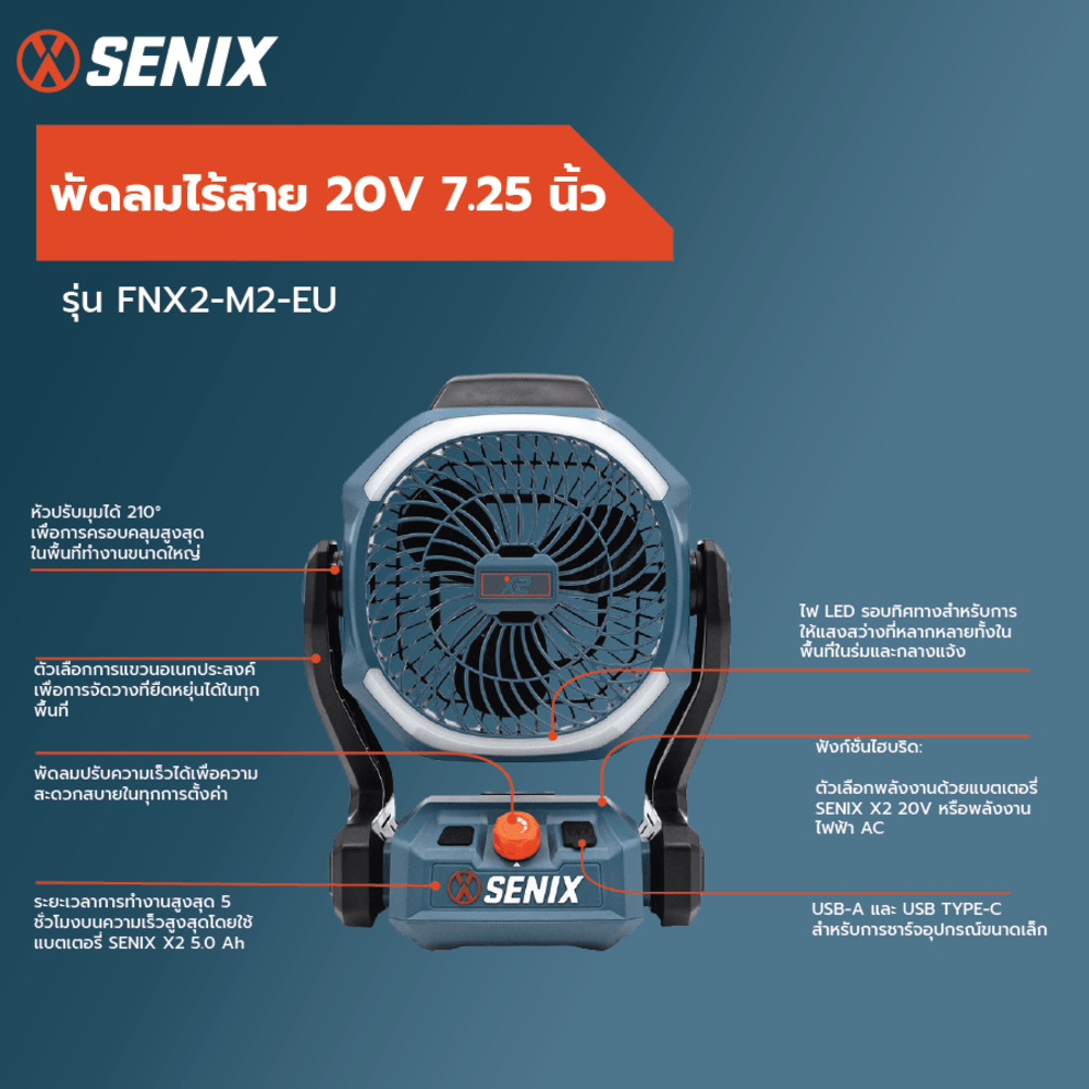 6. ระยะเวลาการทำงานสูงสุด 5 ชั่วโมง บนความเร็วสูงสุดโดยใช้แบตเตอรี่ Senix
