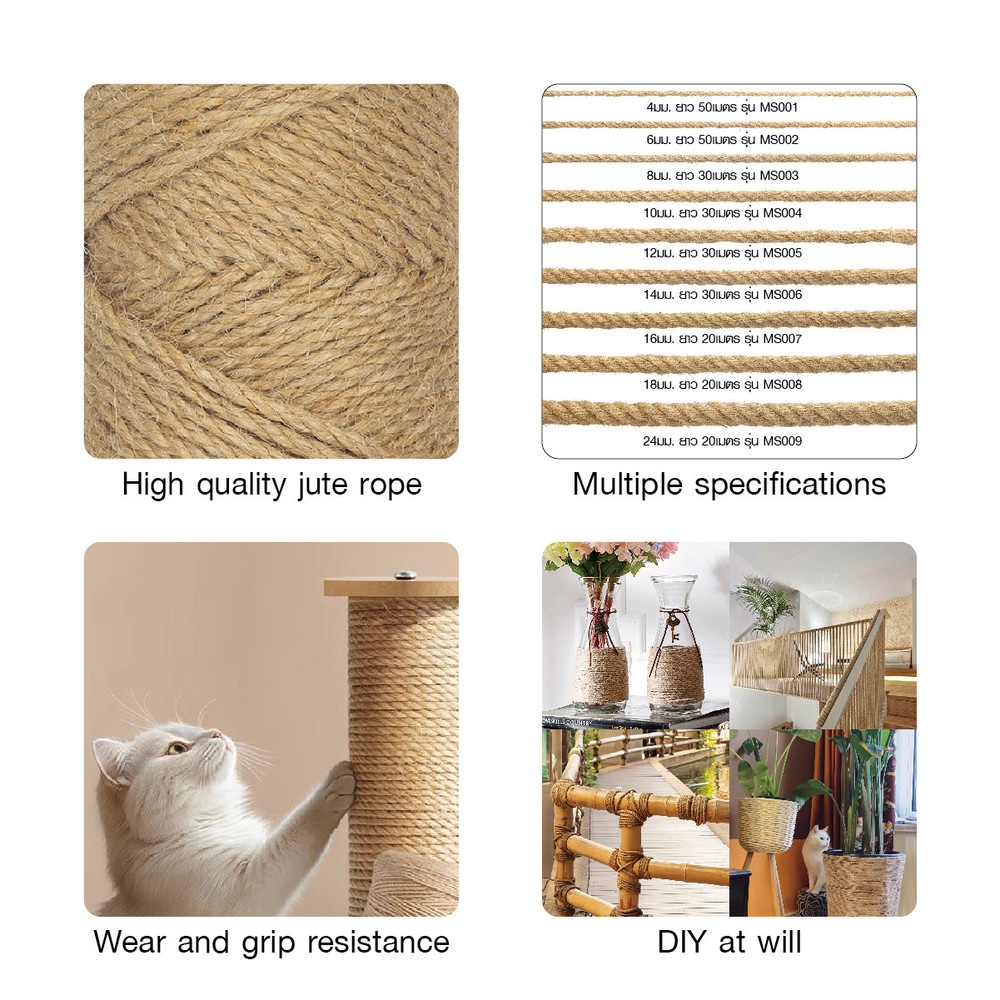 เชือกมะนิลา เป็นผลิตภัณฑ์ที่ผลิตจากวัสดุธรรมชาติ จากใยพืชจากใบป่าน เป็นเชือกลักษณะเกลียว สีน้ำตาล มีความเหนียวทนทานต่อสภาพอากาศ ทนน้ำ มักนิยมใช้เป็นเชือกลากเรือ เชือกดึงชักคะเย่อ เชือกกีฬาสี เชือกทำฐานลูกเสือ เชือกปีนป่าย งาน DIY ที่ลับเล็บแมว คอนโดแมว และอื่นๆ ย่อยสลายได้เองตามธรรมชาติ ปลอดภัยต่อสิ่งแวดล้อม