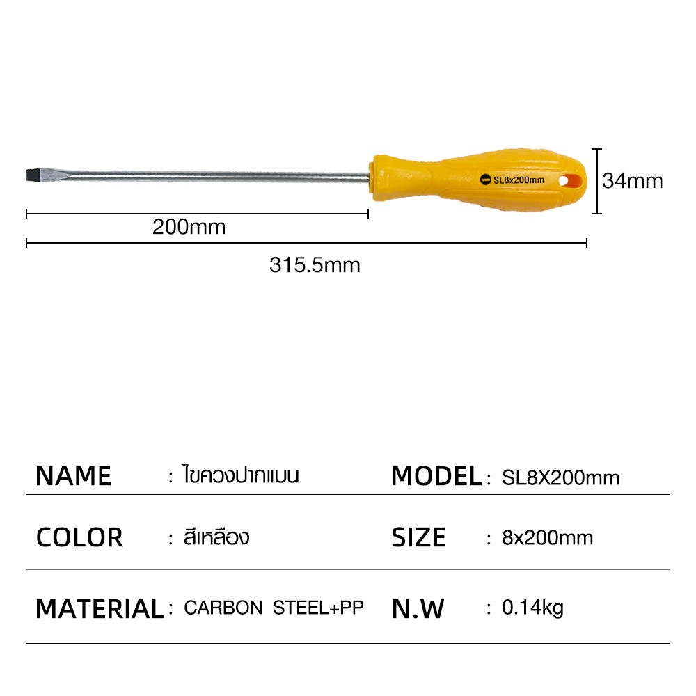 HUMMER ไขควงปากแบน ด้ามพลาสติก รุ่น SL8x200mm สีเหลือง
