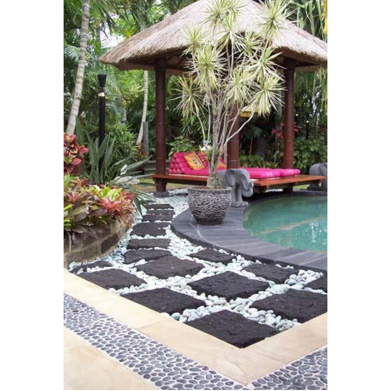 ตกแต่งบริเวณสระน้ำ: การใช้หินประดับตกแต่งสวนเพื่อประดับบริเวณรอบสระน้ำ เช่น การวางหินสระน้ำหรือหินตกแต่งรอบขอบสระ.