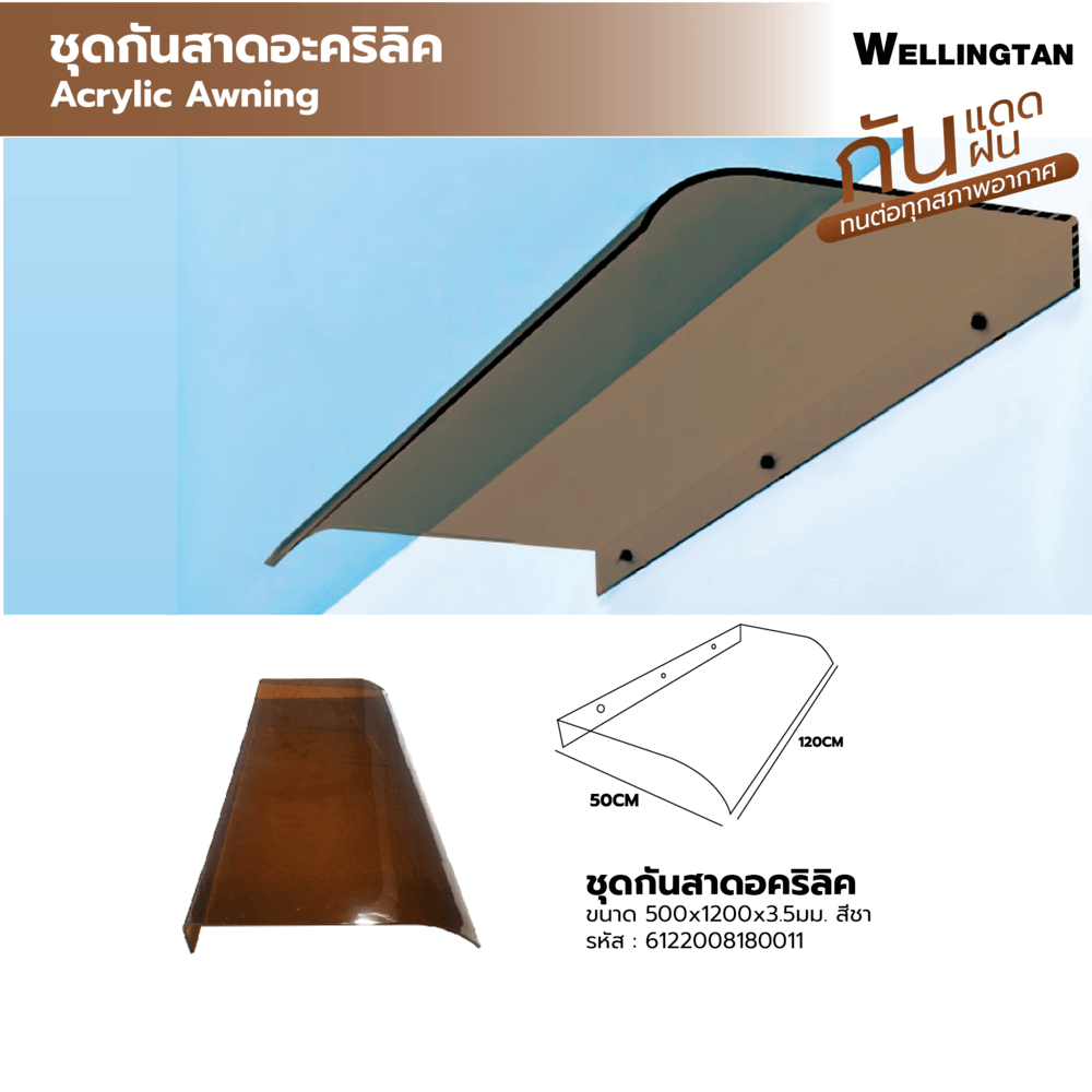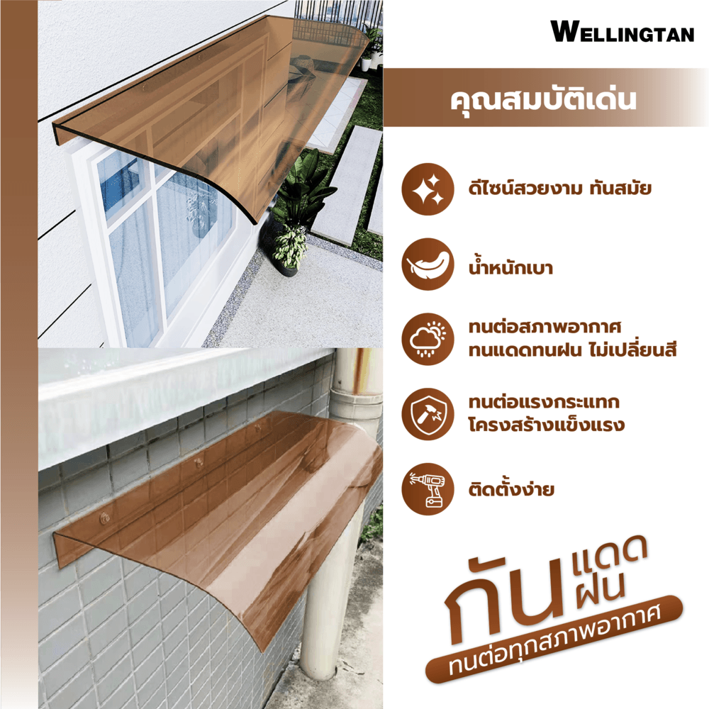 WELLINGTAN ชุดกันสาดโพลีคาร์บอเนต สวยงามหรูหรา คุ้มค่า คุ้มราคา ประหยัดเวลาติดตั้ง ป้องกันแสง UV เหนียวแน่นทนทาน มีความโปร่งใสช่วยให้ประหยัดพลังงาน ทนต่อแรงลม และแรงกระแทกจากน้ำฝนได้ดี น้ำหนักเบา ติดตั้งง่ายสามารถติดตั้งกับผนังได้ทั้งปูนและไม้