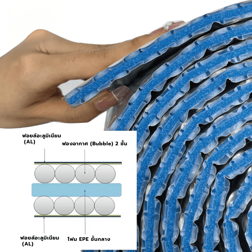 โครงสร้างสินค้า : โครงสร้าง 5 ชั้น AL + Bubble + EPE + Bubble + AL พร้อมฟอยล์สีเงิน 2 ด้าน