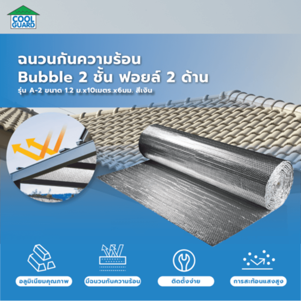 COOL GUARD ฉนวนกันความร้อน Bubble 2 ชั้น ฟอยล์2ด้าน รุ่น A-2 มาพร้อมโครงสร้าง 4 ชั้นที่ประกอบด้วยฟอยล์อะลูมิเนียม 2 ด้านและฟองอากาศ Bubble 2 ชั้น ซึ่งช่วยสะท้อนความร้อนจากแสงอาทิตย์ พร้อมกักเก็บความร้อนได้อย่างมีประสิทธิภาพสูง นอกจากนี้ ฟอยล์สีเงินทั้งสองด้านยังช่วยเพิ่มการสะท้อนรังสีความร้อน ลดการถ่ายเทความร้อนเข้าสู่อาคารอย่างเห็นได้ชัด