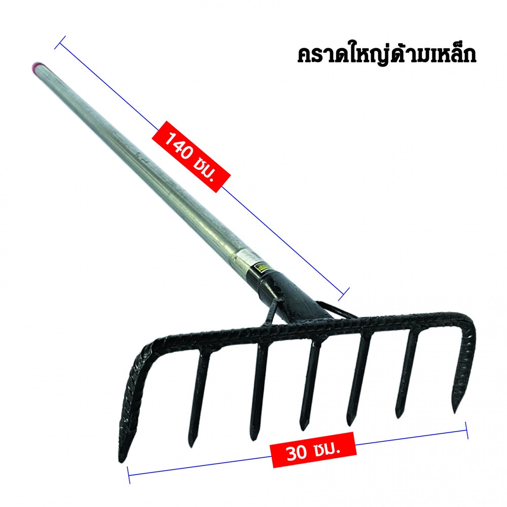 ราดใหญ่ด้ามเหล็ก syp5008 ขนาดความยาวด้าม 1.40 เชนติเมตร ทำด้วยเหล็กกล้าอย่างดี มีความคงทนสูงปลายชี่ฟันเจียร์ให้แหลมเพื่อการจิกกวดขยะมูลฝอยได้ดีกว่าด้ามทำด้วยเหล็กชุบกัลวาไน จึงแข็งแรงทนทานไม่เป็นสนิมง่าย