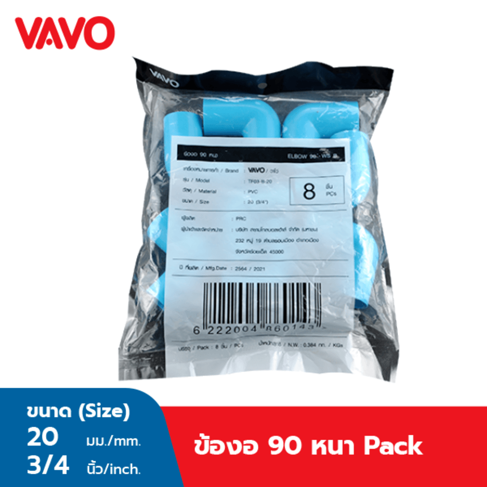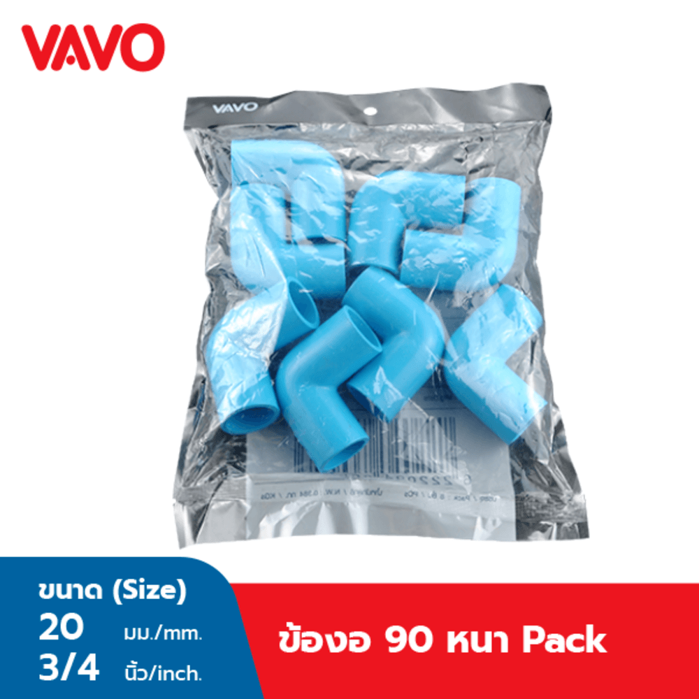 VAVO ข้องอ 90 หนา 3/4"(20) สีฟ้า (แพ็ค 8) เป็นอุปกรณ์เชื่อมต่อท่อ PVC ที่มีความแข็งแรงทนทาน ผลิตจากวัสดุ PVC คุณภาพสูง ช่วยให้การเดินท่อเปลี่ยนทิศทางเป็นมุม 90 องศาได้อย่างง่ายดาย เหมาะสำหรับงานติดตั้งระบบน้ำประปาภายในบ้าน หรือในงานอุตสาหกรรมขนาดเล็ก การติดตั้งทำได้ง่ายเพียงแค่สวมลงบนท่อ PVC ที่มีขนาดเท่ากัน