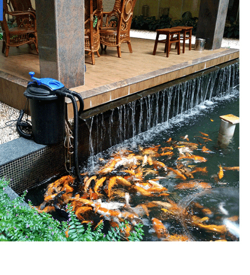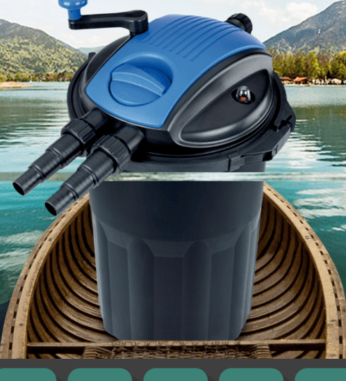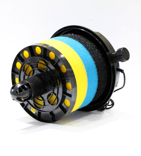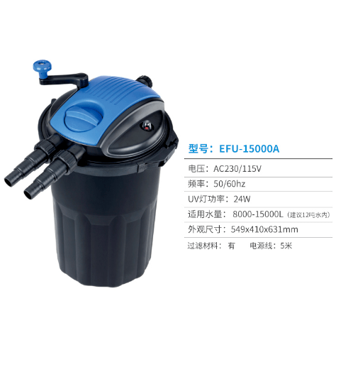 เหมาะสำหรับอ่างปลาเล็กๆที่ไม่เกิน 5 เมตรกว้าง 3 เมตรลึก 2 เมตร ตัวช่วยในการถ่ายน้ำให้มีอากาศออกซิเจนในน้ำมากขึ้น การหมุนเวียนของน้ำดีขึ้น และมีลูกกลิ้งคอยทำความสะอาดหรือว่า รีบตะไคร่ที่เกาะอยู่บนแผ่นกรองน้ำ