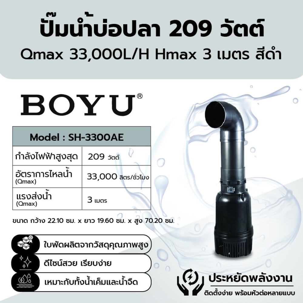 🚀 ด้วยปั๊มน้ำ BOYU รุ่น SH-3300AE ขนาด 209W ที่มีอัตราการไหลสูงสุดถึง 33,000 ลิตรต่อชั่วโมง!
