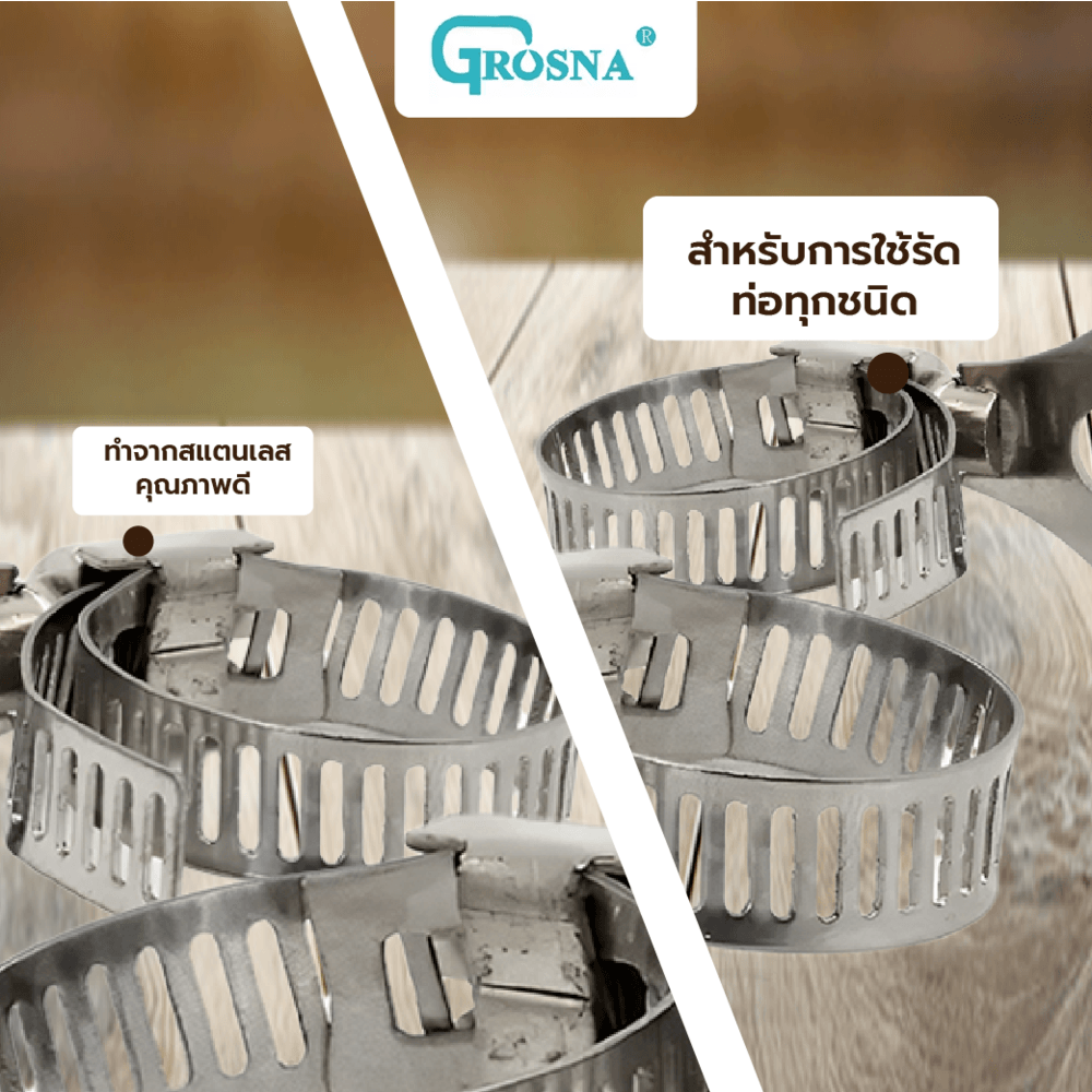 Grosna กิ๊ปรัดสายยางหางปลาสแตนเลส 6-16mm(1/4”-5/8”),(2หุน-5หุน)