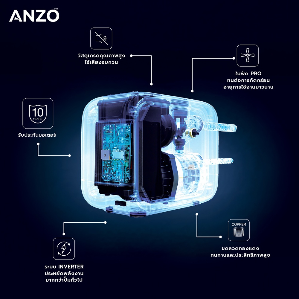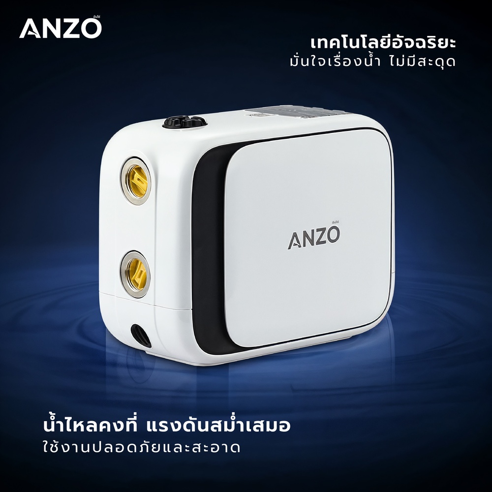 ปั๊มน้ำอัตโนมัติ ANZO รุ่น ZBP2-30 มาพร้อมเทคโนโลยีอินเวอร์เตอร์อัจฉริยะที่ช่วยให้การจ่ายน้ำต่อเนื่อง ไม่มีสะดุด เงียบ ประหยัดพลังงาน และปลอดภัยสูงสุด ตัวเครื่องผลิตจากพลาสติกไทเทเนียม (Plastic Titanium) แข็งแรง ไม่เป็นสนิม และเป็นมิตรต่อสิ่งแวดล้อม มอเตอร์ทองแดงแท้พร้อมระบบป้องกันครบวงจร เช่น ป้องกันน้ำแห้ง น้ำแข็งเกาะ ไฟตก ไฟเกิน และไฟรั่ว รวมทั้งมีระบบตัดการทำงานอัตโนมัติเมื่อเกิดความผิดปกติ รองรับแรงดันสูงสุด 35 เมตร และอัตราการไหล 83 ลิตร/ชั่วโมง เหมาะกับบ้านพักอาศัยและอาคารทั่วไป การติดตั้งง่าย ดีไซน์กะทัดรัด น้ำหนักเบา มาพร้อมสายไฟมาตรฐาน EU Plug ยาว 1.5 เมตร และหน้าจอแสดงผล LED อัจฉริยะ จึงเป็นตัวเลือกที่ตอบโจทย์ทั้งความสะดวกสบาย ความทนทาน และความปลอดภัย