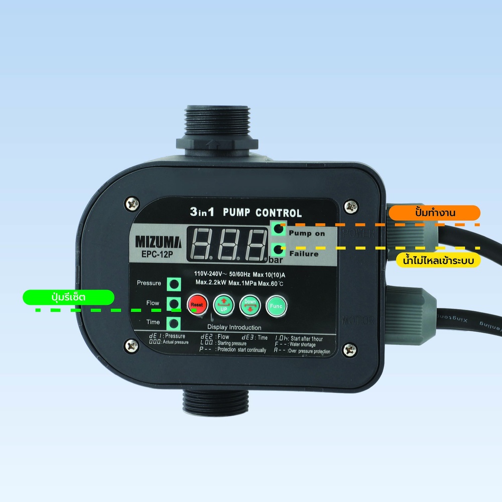มีไฟแสดงสถานะการทำงาน (Power on, Pump on, Failure) และปุ่มรีเซ็ตใช้งานง่าย