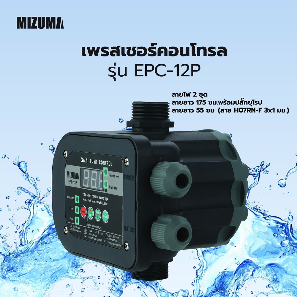 🔹 เพรสเชอร์คอนโทรล MIZUMA รุ่น EPC-12P อุปกรณ์ควบคุมการทำงานของปั๊มน้ำอัตโนมัติ สามารถควบคุมแรงดันน้ำให้คงที่และตัดการทำงานเมื่อไม่มีน้ำหรือแรงดันผิดปกติ เพื่อยืดอายุการใช้งานของปั๊มน้ำ เหมาะสำหรับบ้านพักอาศัย อาคารพาณิชย์ และงานที่ต้องการระบบน้ำที่มีความเสถียร