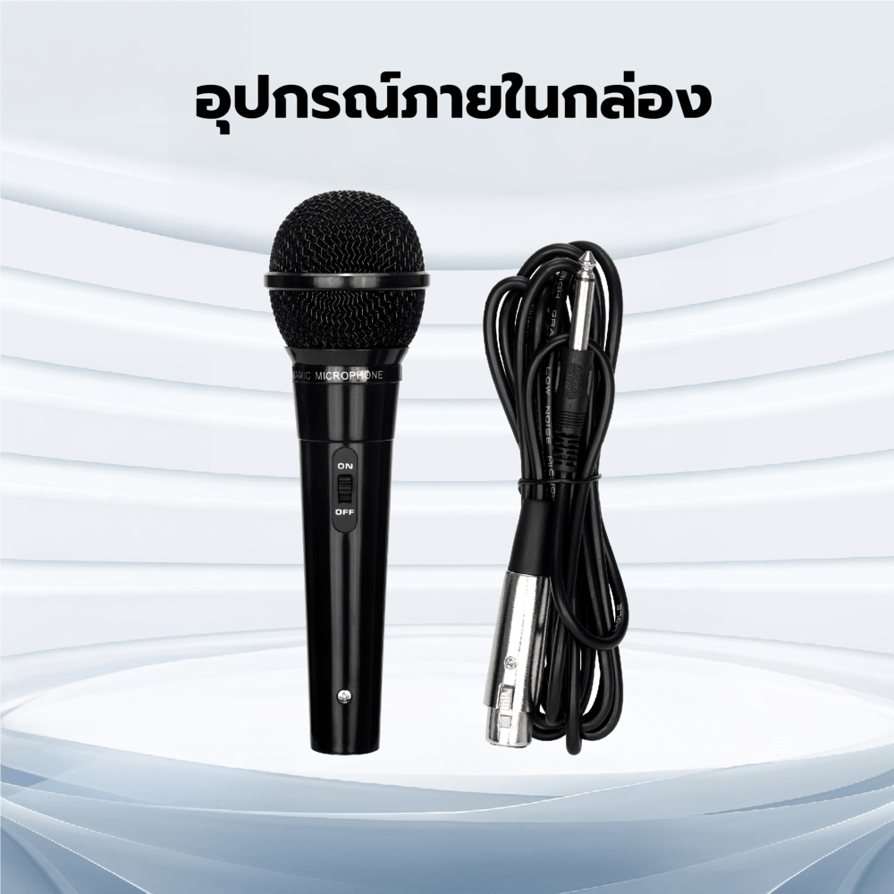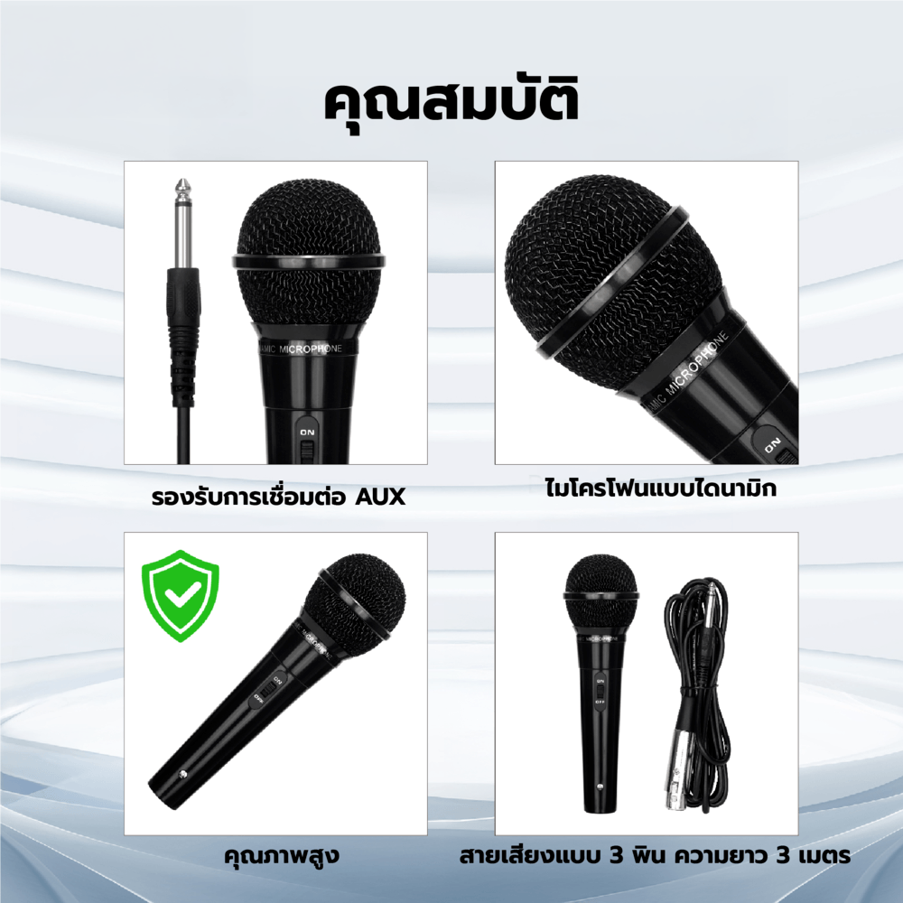 วัสดุสินค้า: พลาสติก + โลหะ ประเภทไมโครโฟน: ไมโครโฟนแบบไดนามิก ทิศทาง: คาร์ดิออยด์ (Cardioid) การตอบสนองความถี่: 40Hz -18kHz ความไว (1kHz): -51,554dBV/Pa/2,7mV/Pa การเชื่อมต่อของไมโครโฟน: ปลั๊กเสียงพิเศษแบบ 3พินยาว 2 เมตร (ความต้านทานต่อไฟฟ้า