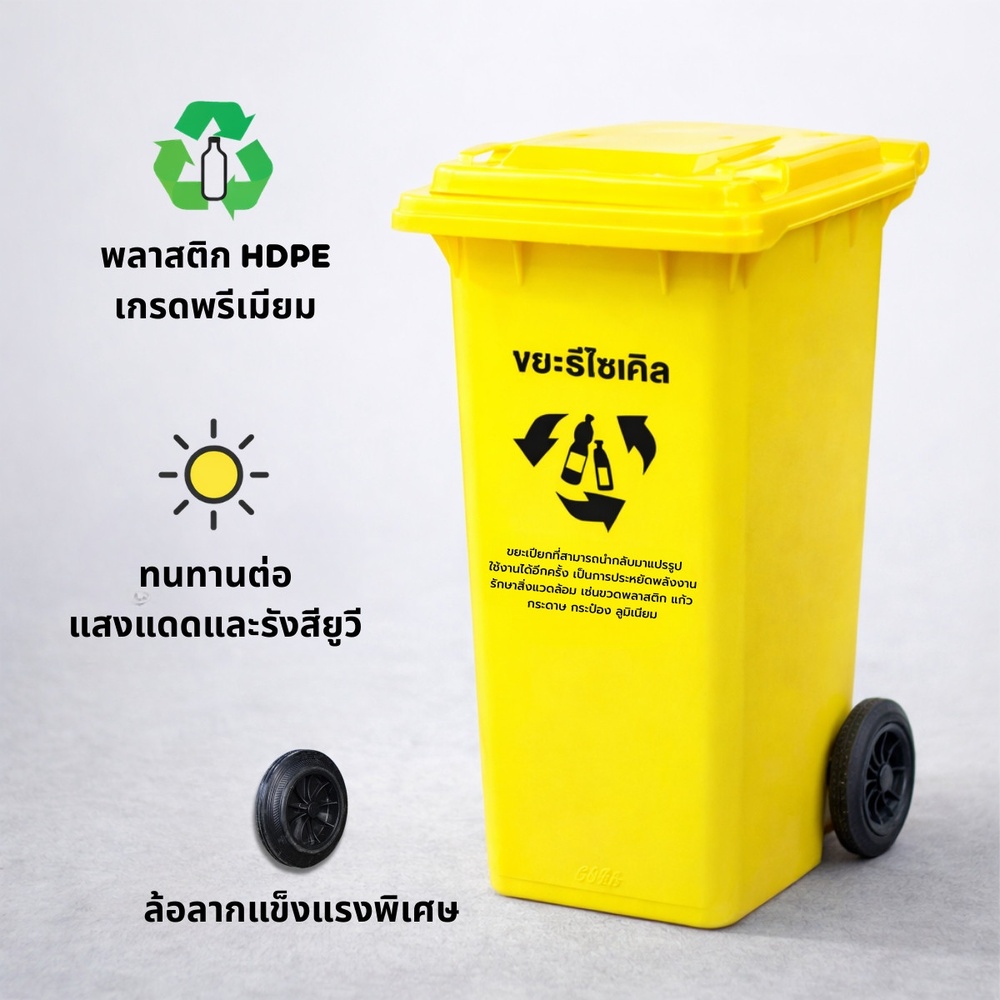KLEANZY ถังขยะเทศบาลรุ่น 240 ลิตร (สีเหลือง) คือทางเลือกที่สมบูรณ์แบบสำหรับสถานประกอบการที่ต้องการระบบการจัดการขยะที่มีประสิทธิภาพ ด้วยขนาดความจุที่ใหญ่เป็นพิเศษ ช่วยลดภาระในการนำขยะไปทิ้งบ่อยครั้ง และด้วยสีเหลืองที่เป็นมาตรฐานสากล จึงช่วยสร้างระบบคัดแยกขยะที่ดีให้แก่พื้นที่ของคุณ