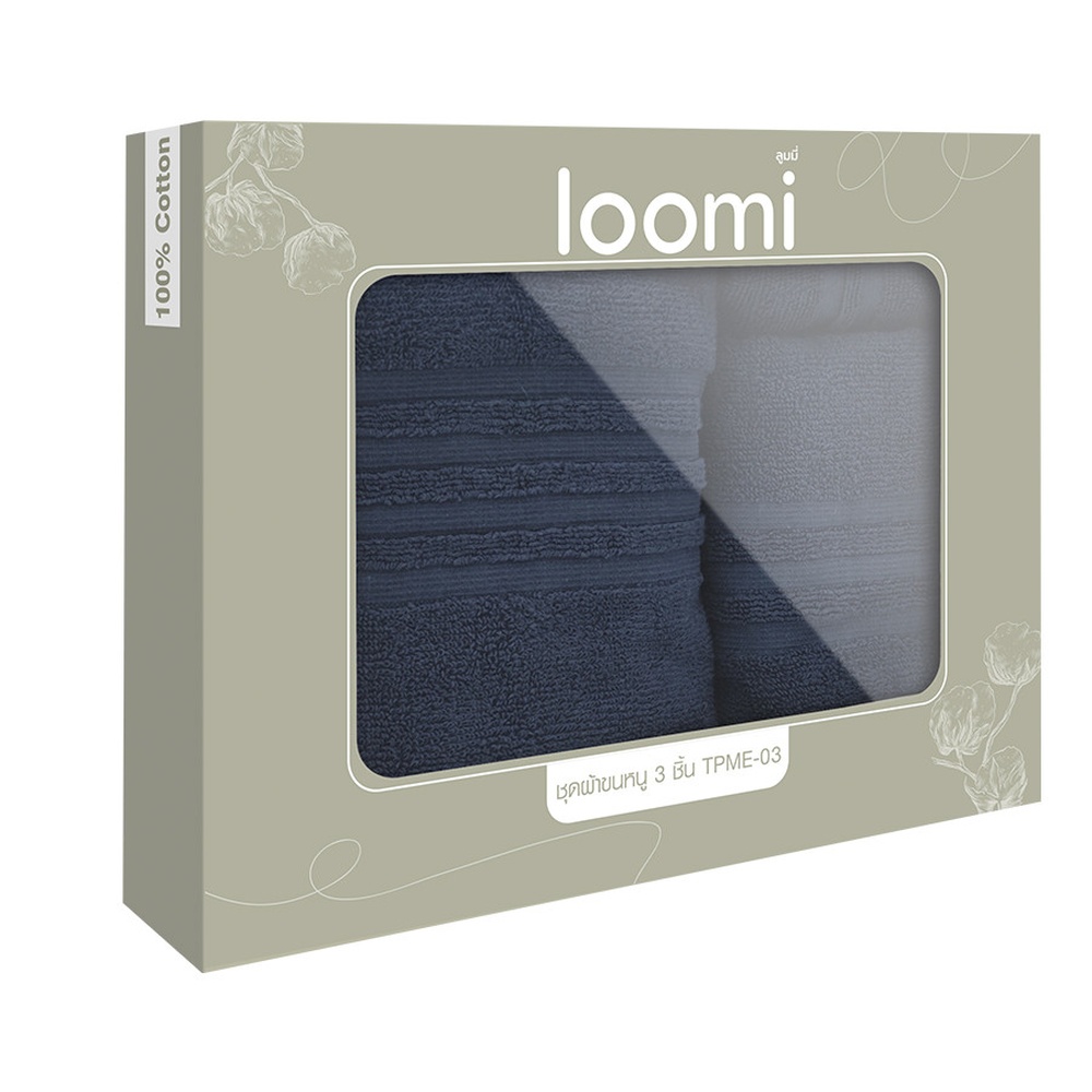 ผ้าขนหนู loomi Gift Set รุ่น TPME-03 ผลิตจากเนื้อผ้าคุณภาพดี ให้สัมผัสนุ่ม ซับน้ำได้ดี เหมาะสำหรับการใช้งานในชีวิตประจำวัน ภายในชุดประกอบด้วยผ้าขนหนูหลายขนาด รองรับการใช้งานทั้งเช็ดหน้า เช็ดผม และเช็ดตัว โทนสีน้ำเงินเข้มให้ความรู้สึกสุภาพ เรียบหรู และทันสมัย เข้ากับห้องน้ำได้หลากหลายสไตล์ ชุดเซ็ตบรรจุอย่างเรียบร้อย เหมาะสำหรับซื้อใช้เองหรือมอบเป็นของขวัญ