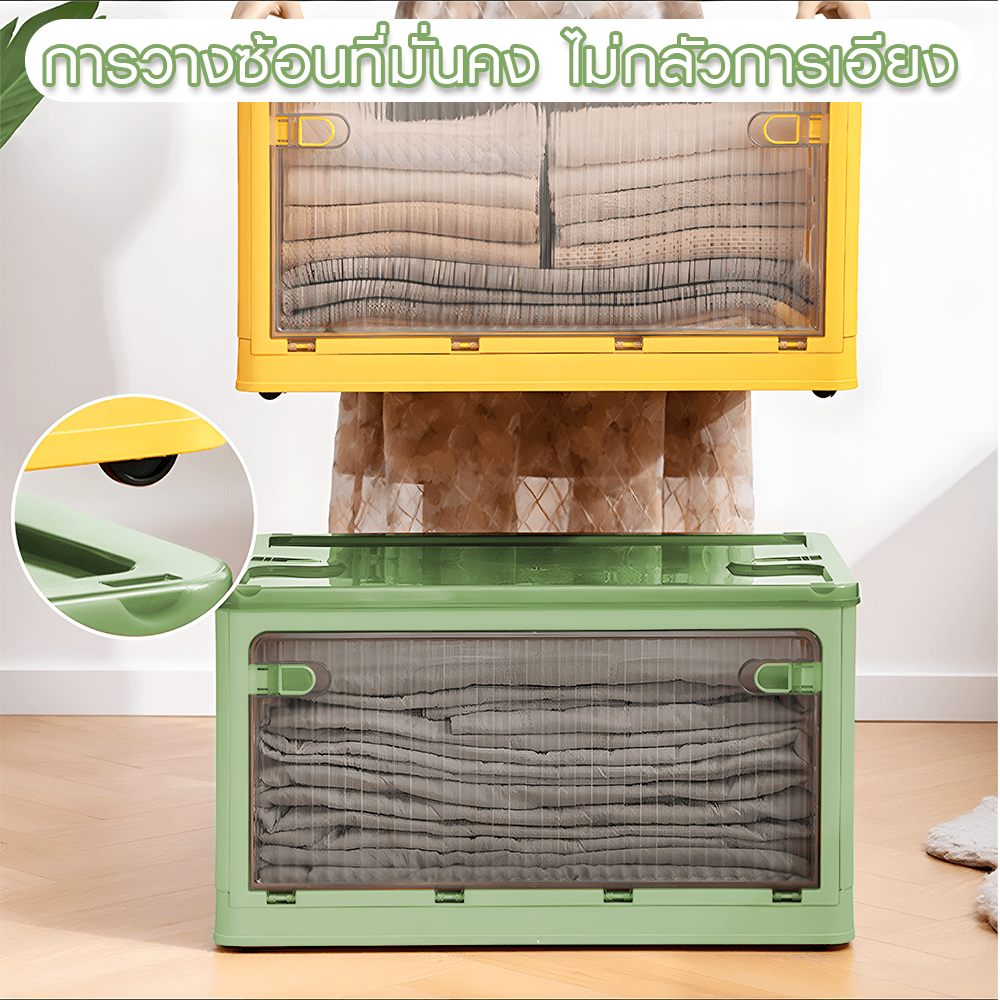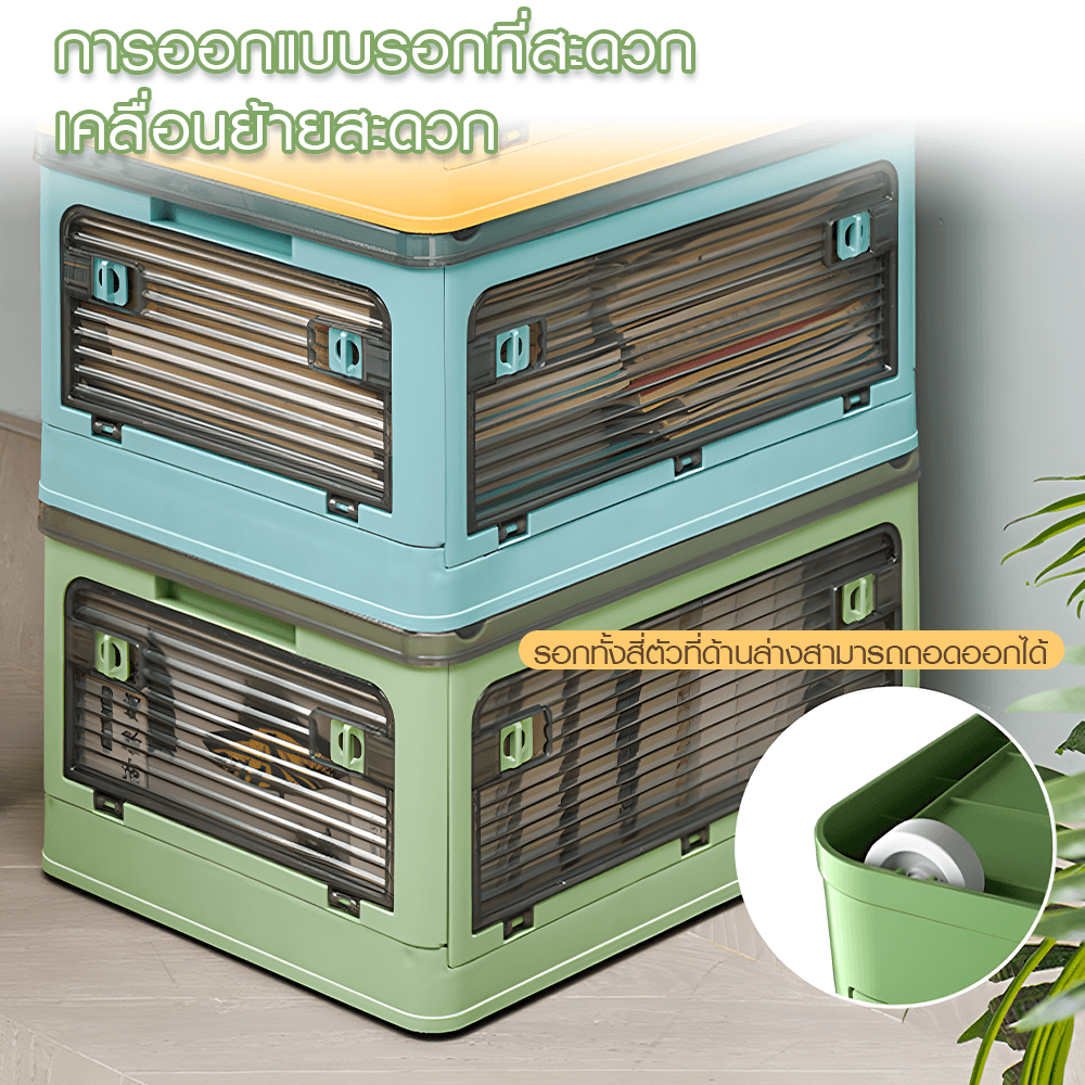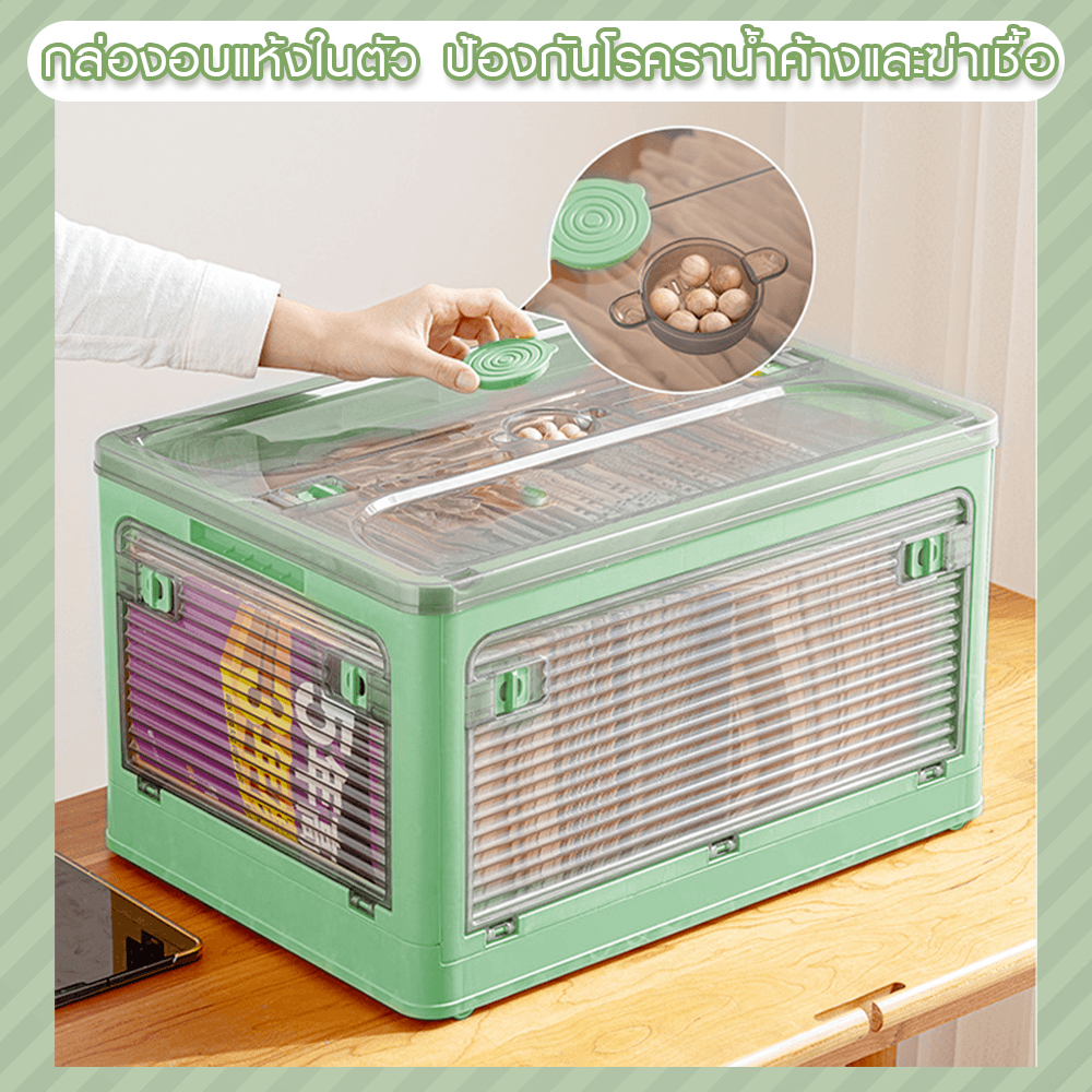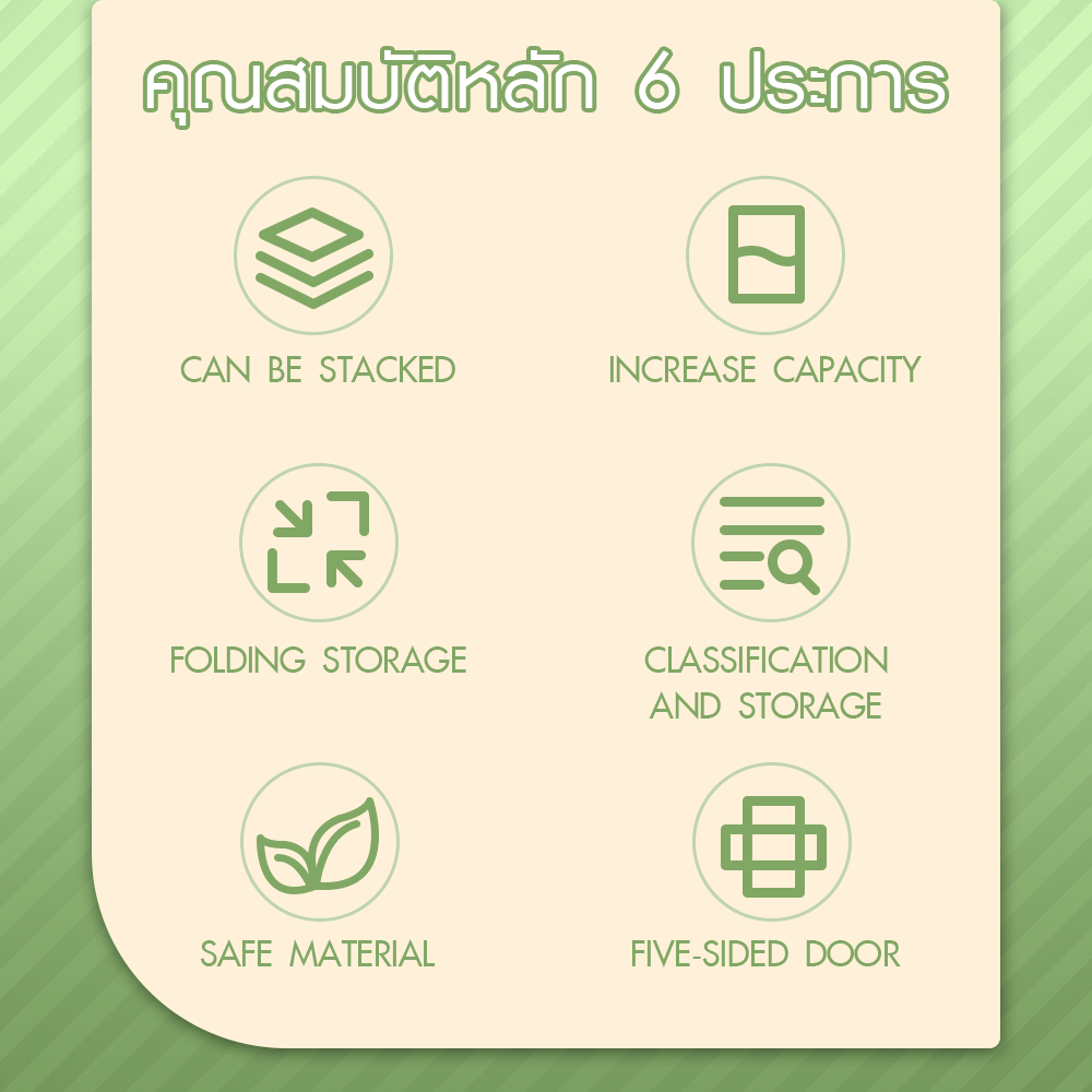 กล่องมีลักษณะเป็นทรงสี่เหลี่ยม ทำจากพลาสติก PP สีเขียว ผิวอาจเป็นแบบเรียบหรือมีลวดลายเล็กน้อย ด้านหน้ามีบานเปิดพลาสติกใสที่มักจะมีซิปหรือตัวล็อกสำหรับเปิด-ปิด ด้านบนก็มีฝาเปิดพร้อมซิปเช่นกัน ภายในเมื่อกางออกจะเห็นโครงเหล็กที่ช่วยค้ำยันให้กล่องคงรูป และมีหูหิ้วผ้าที่ด้านข้าง
