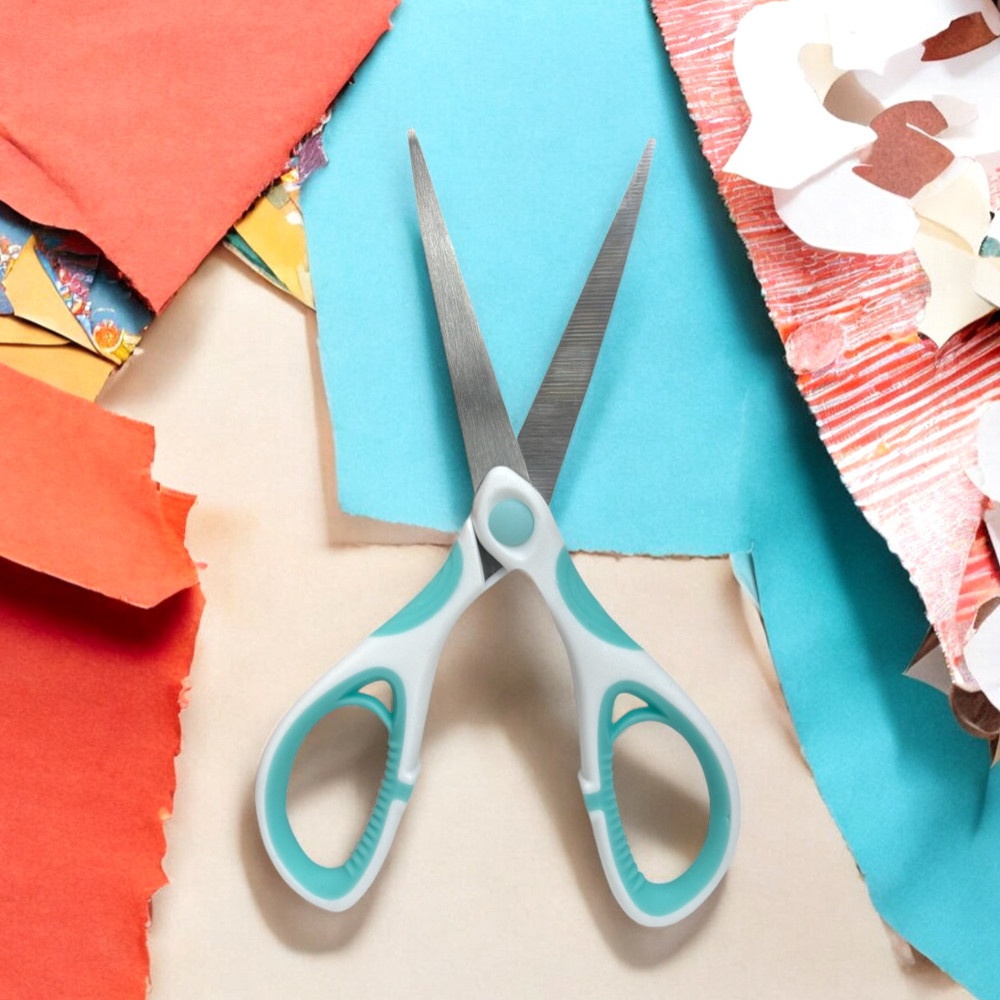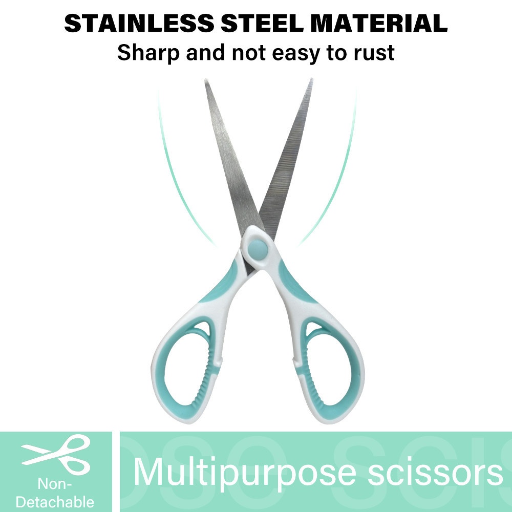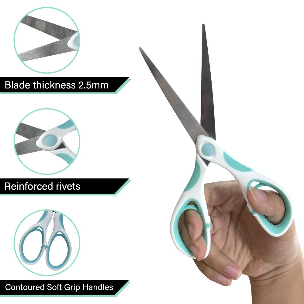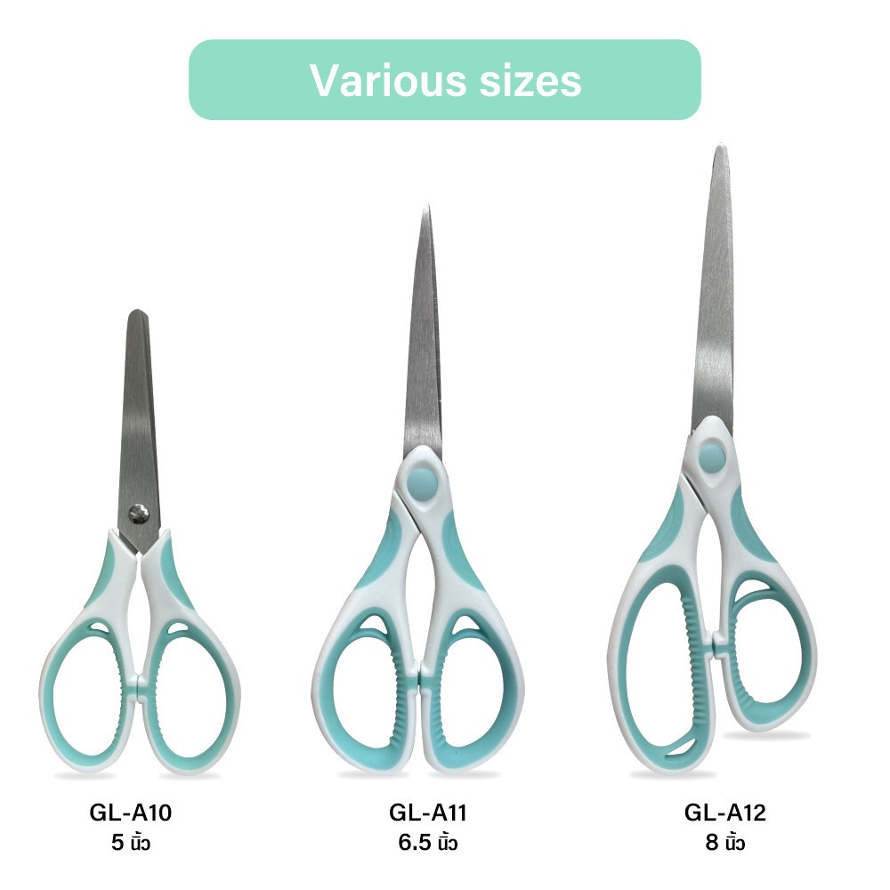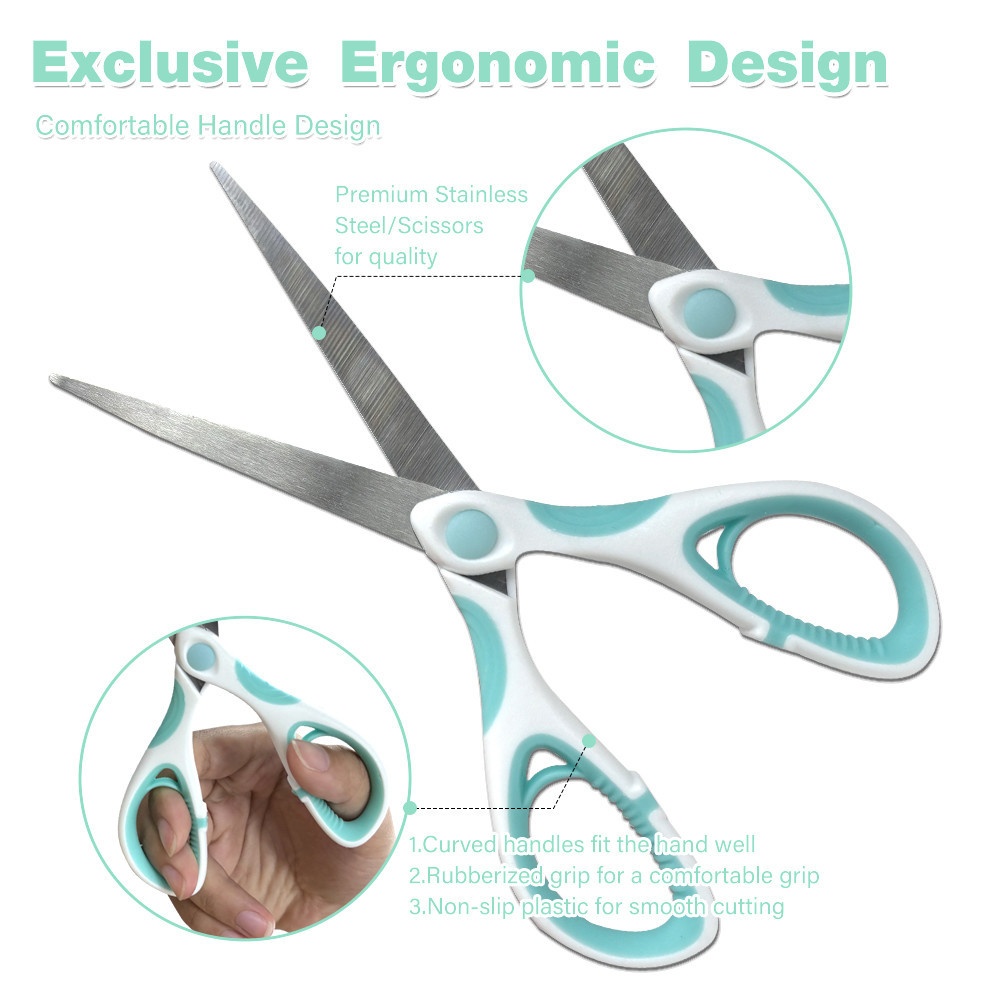 กรรไกรมีลักษณะที่ทันสมัย ด้ามจับเป็นพลาสติก 2 สี โดยส่วนโครงหลักเป็นสีขาวและอาจมีส่วนที่สัมผัสนิ้วเป็นพลาสติกนุ่มสีเขียวเพื่อเพิ่มความกระชับ ใบมีดเป็นโลหะสีเงินเงางาม ปลายแหลมคมสำหรับงานที่ต้องการความแม่นยำ