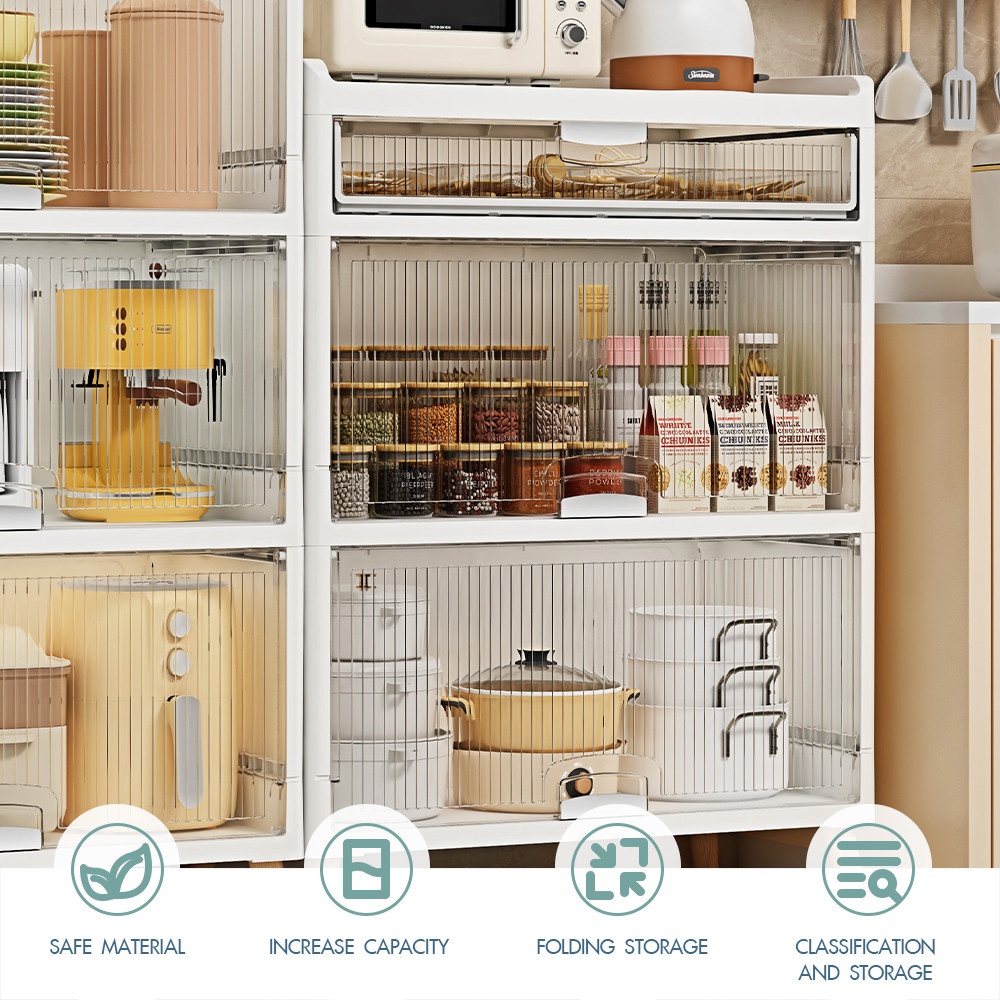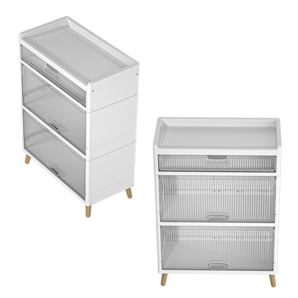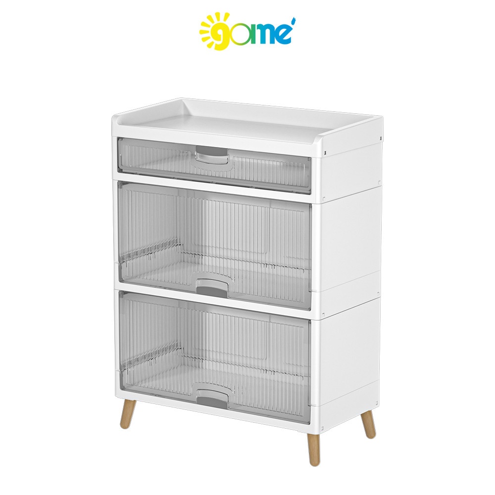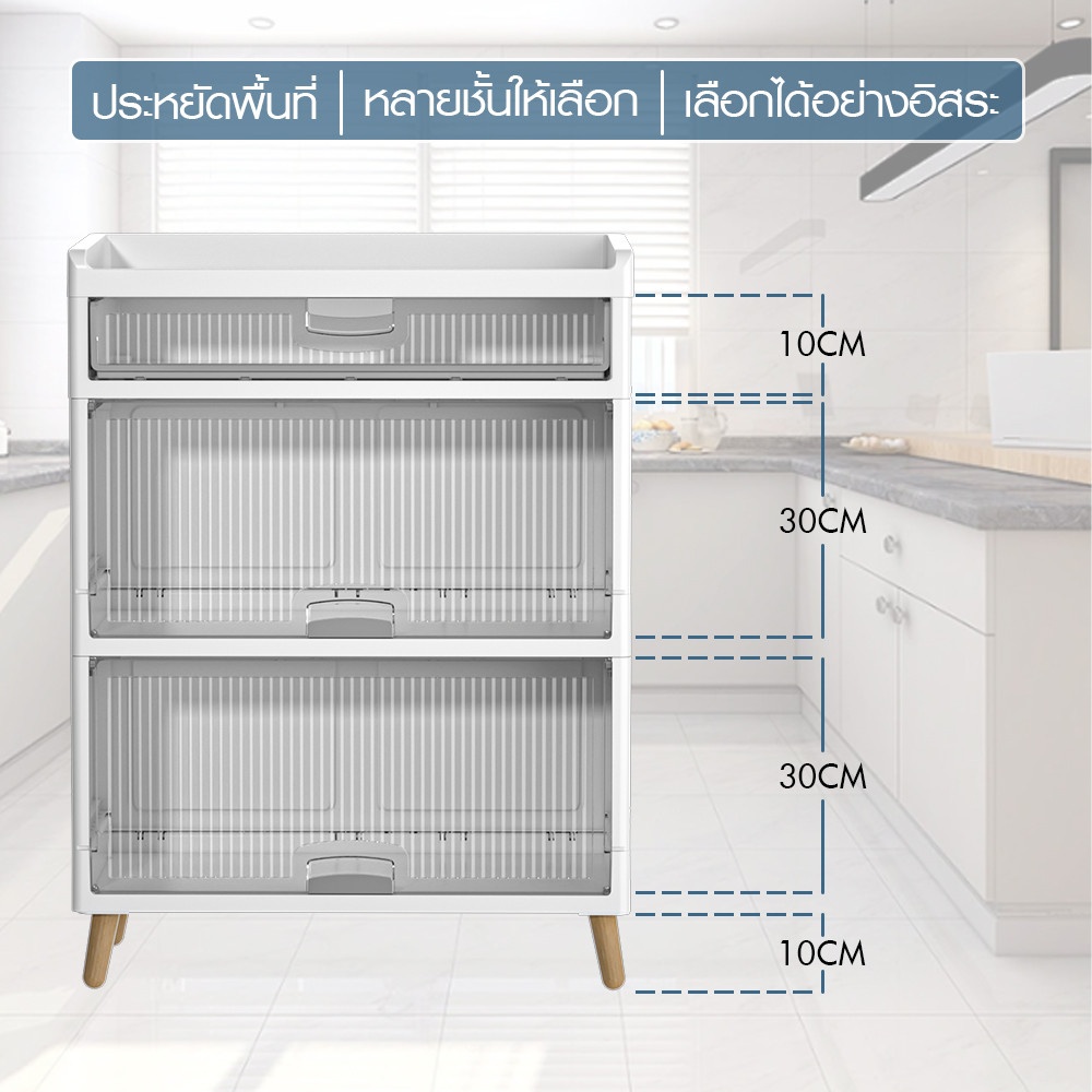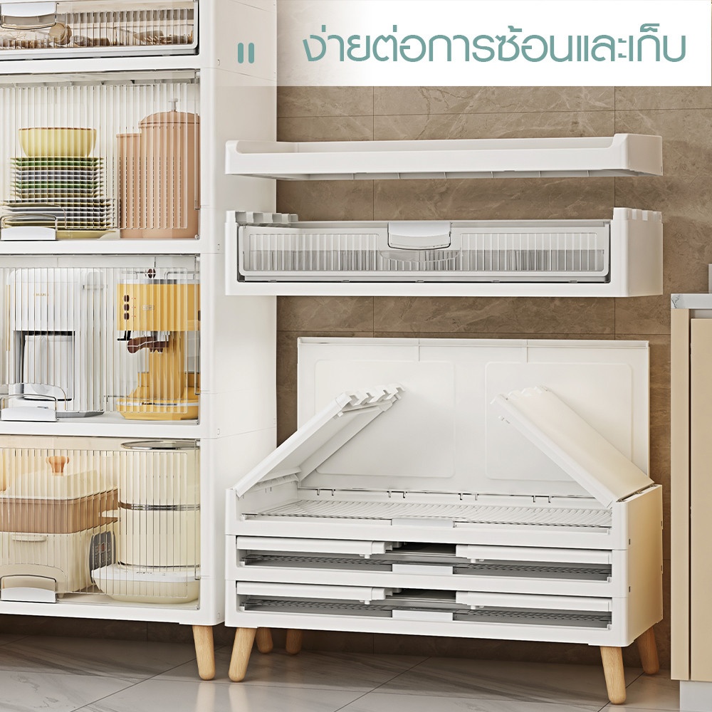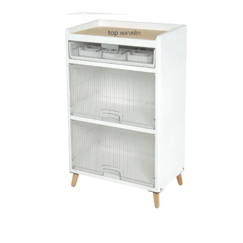 ตู้มีลักษณะเป็นกล่องสี่เหลี่ยมสีขาวสะอาดตา ตั้งอยู่บนขาไม้ 4 ขาที่สอบเข้าเล็กน้อยและเอียงออกเพื่อความมั่นคงตามหลักดีไซน์สแกนดิเนเวีย มีมือจับที่เรียบง่ายหรืออาจเป็นแบบเจาะร่องเพื่อความมินิมอล เมื่อเปิดบานตู้ออกจะพบกับชั้นวางสำหรับจัดเก็บของภายใน