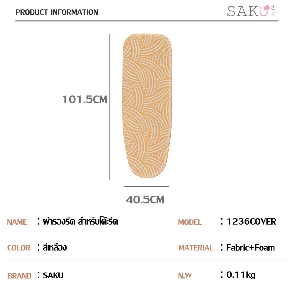 SAKU ผ้ารองรีด รุ่น 1236 Cover ออกแบบมาเพื่อเพิ่มประสิทธิภาพในการรีดผ้า ช่วยให้ผ้าเรียบเร็ว กระจายความร้อนได้ดี ลดเวลาในการรีด เนื้อผ้ามีความทนทาน รองรับความร้อนจากเตารีดได้อย่างมีประสิทธิภาพ พร้อมดีไซน์สีเหลืองสดใส ช่วยให้โต๊ะรีดผ้าดูสะอาดและน่าใช้งานมากยิ่งขึ้น