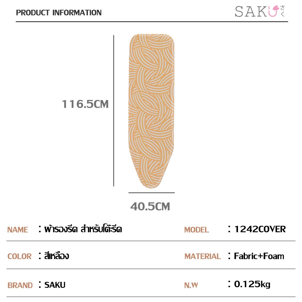 SAKU ผ้ารองรีด รุ่น 1242 Cover ช่วยเพิ่มประสิทธิภาพในการรีดผ้า รองรับความร้อนจากเตารีดได้ดี ช่วยให้ผ้าเรียบเร็ว ลดแรงและเวลาในการรีด เหมาะสำหรับเปลี่ยนทดแทนผ้ารองรีดเดิมที่เสื่อมสภาพ พร้อมดีไซน์สีเหลืองสดใส ช่วยให้โต๊ะรีดผ้าดูสะอาดและเป็นระเบียบ