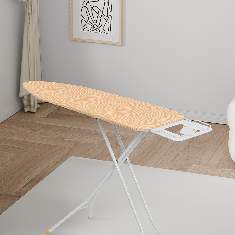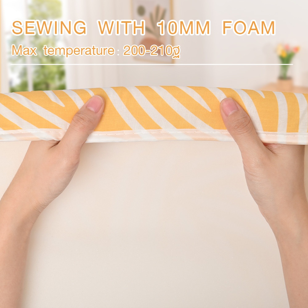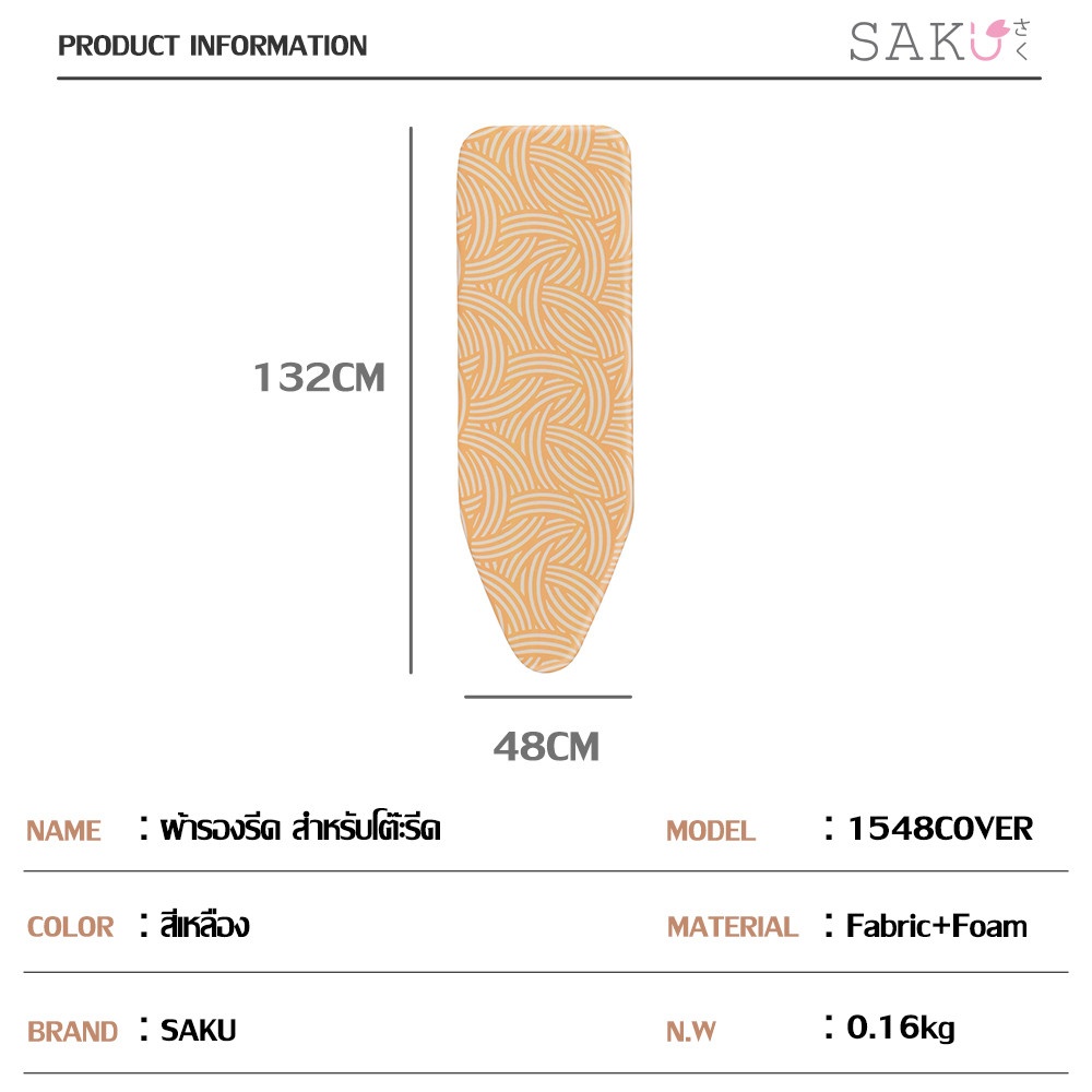 SAKU ผ้ารองรีด รุ่น 1548 Cover ช่วยเพิ่มประสิทธิภาพในการรีดผ้า รองรับความร้อนจากเตารีดได้อย่างสม่ำเสมอ ช่วยให้ผ้าเรียบเร็ว ลดแรงกดและประหยัดเวลาในการรีด เหมาะสำหรับเปลี่ยนผ้ารองรีดเดิมที่เสื่อมสภาพ ดีไซน์สีเหลืองช่วยให้โต๊ะรีดผ้าดูสะอาด เป็นระเบียบ และใช้งานได้ยาวนาน