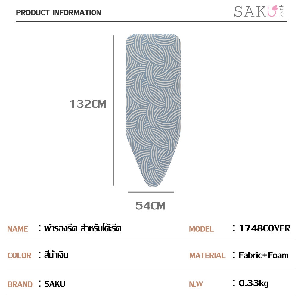 SAKU ผ้ารองรีด รุ่น 1748 Cover ออกแบบมาเพื่อเพิ่มประสิทธิภาพในการรีดผ้า รองรับความร้อนจากเตารีดได้อย่างสม่ำเสมอ ช่วยให้ผ้าเรียบเร็ว ลดแรงกด และประหยัดเวลาในการรีด เหมาะสำหรับเปลี่ยนทดแทนผ้ารองรีดเดิมที่เสื่อมสภาพ ดีไซน์สีน้ำเงินช่วยให้โต๊ะรีดผ้าดูเรียบร้อย สะอาดตา เหมาะสำหรับการใช้งานภายในบ้าน