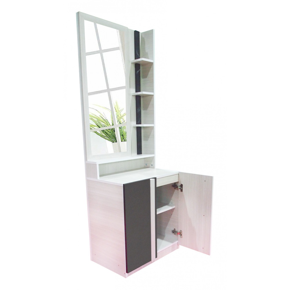 โต้ะเครื่องแป้งรุ่น Tendy ผลิตจากไม้ PB และ MDF เกรด A ขนาด 40x60x170 CM. มีชั้นวางเครื่องสำอางอยู่มุม และมีกระจกเงาที่ขนาดพอดีตัว ด้านล่างมีบานเปิด 2 บาน ไว้สำหรับเก็บของใช้ส่วนตัว