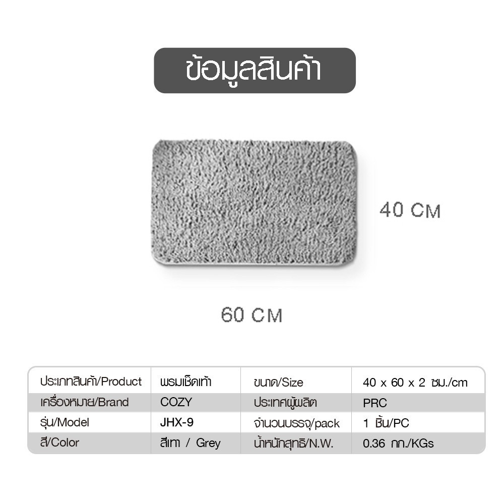 COZY พรมเช็ดเท้า 40×60×2cm. รุ่น JHX-9 สีเทา