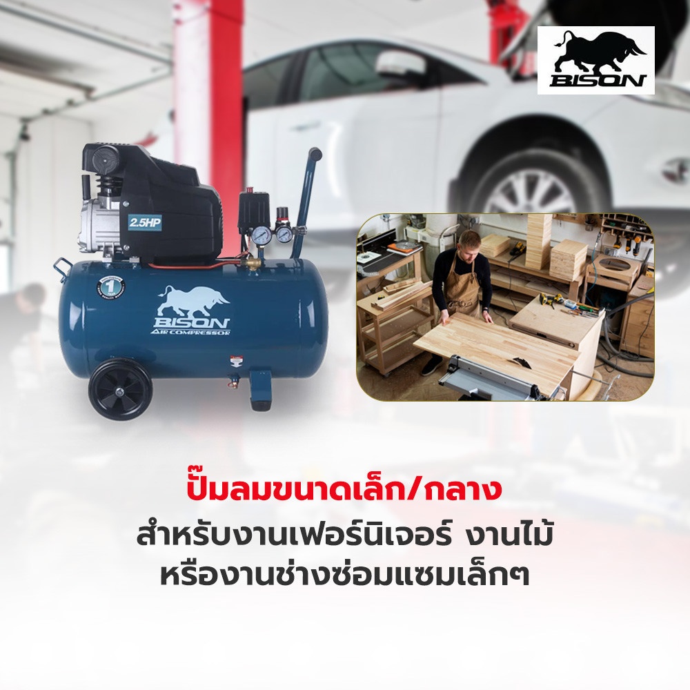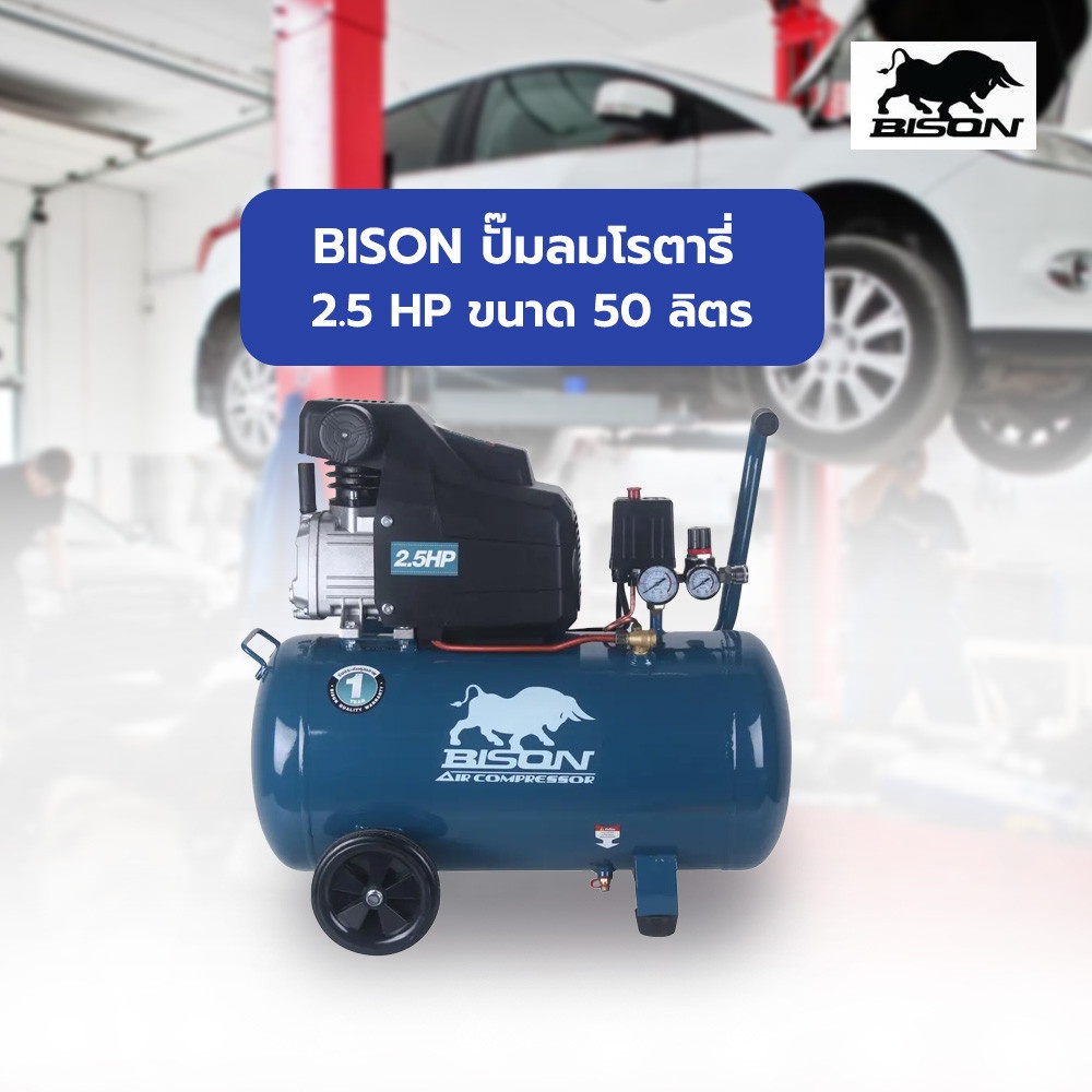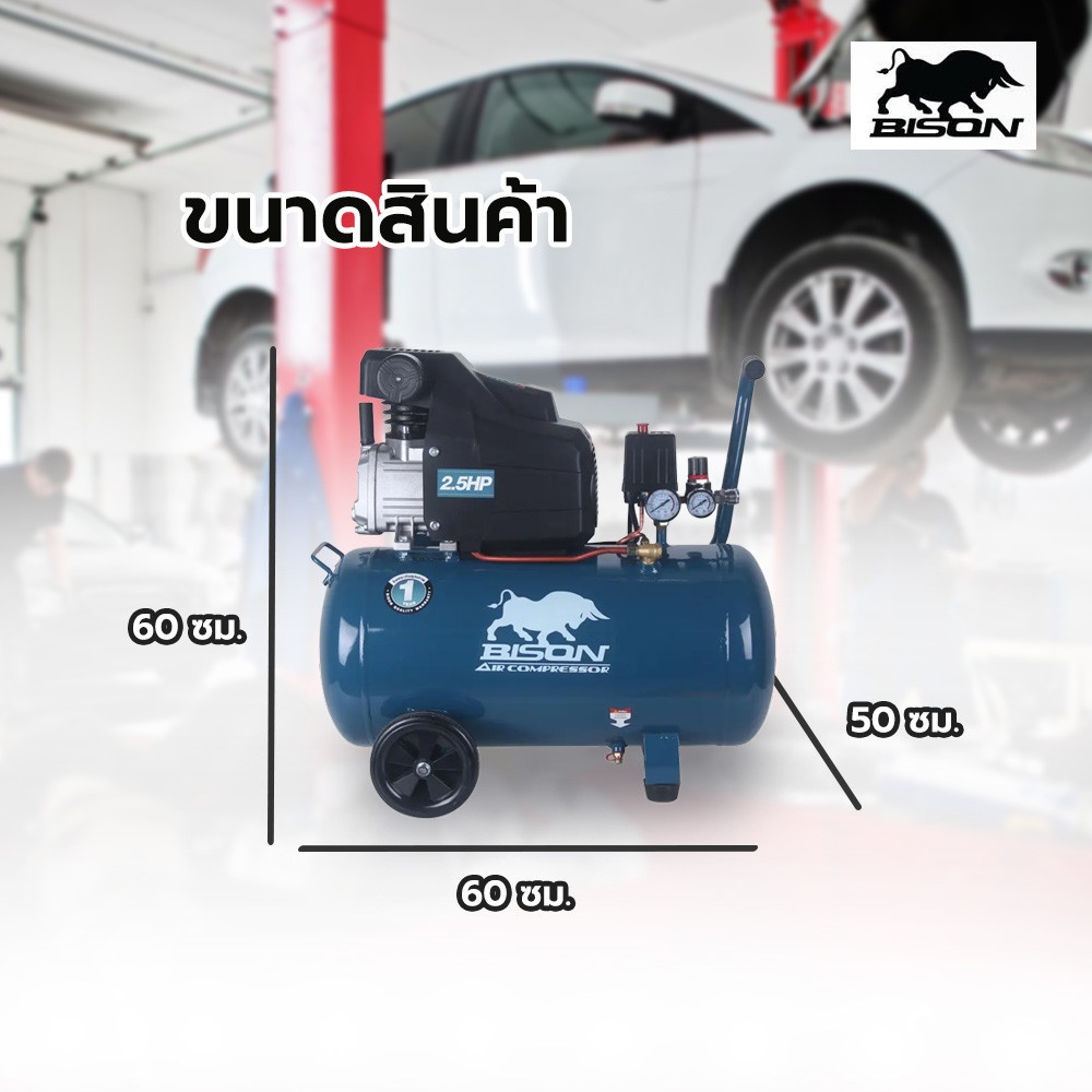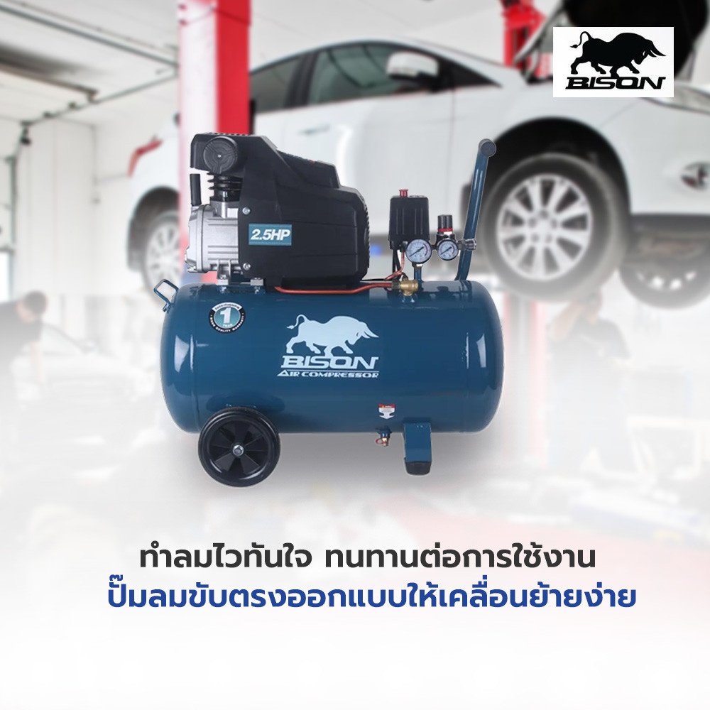 ปั๊มลมขับตรงขนาด 2.5 แรงม้า ถังลมขนาด 50 ลิตร กำลังมอเตอร์ 1.7 กิโลวัตต์ น้ำหนัก 37 กิโลกรัม