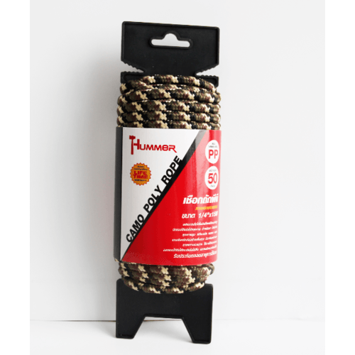 ผลิตจากเส้นใยโพลีพล็อบพีลีนแรงดึงสูง ทำให้มัดของได้แน่น ไม่หลุดง่าย แกนเชือกถักกันอย่างแข็งแรง มีระเบียบสม่ำเสมอ ยืดตัวน้อย น้ำหนักเบา ลายพรางสวยงาม เหมาะสำหรับการตั้งแคมป์, ทะเล, อเนกประสงค์ ทนแดด ทนฝน ออกแบบให้จับได้กระชับมือไม่ลื่นและทนต่อแรงเสียดสีได้ดี รับประกันตลอดอายุการใช้งาน
