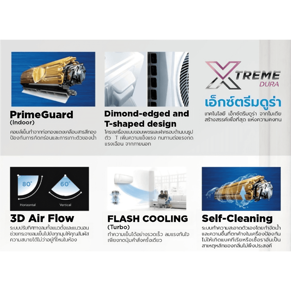 - 3D Air Flow ระบบปรับทิศทางลม ทั้งแนวตั้งและแนวนอน ช่วยกระจายลมเย็นไปยังทุุกมุุม ให้คุุณสัมผัส ความสบาย ไม่ว่าจะอยู่ที่่ไหนในห้อง