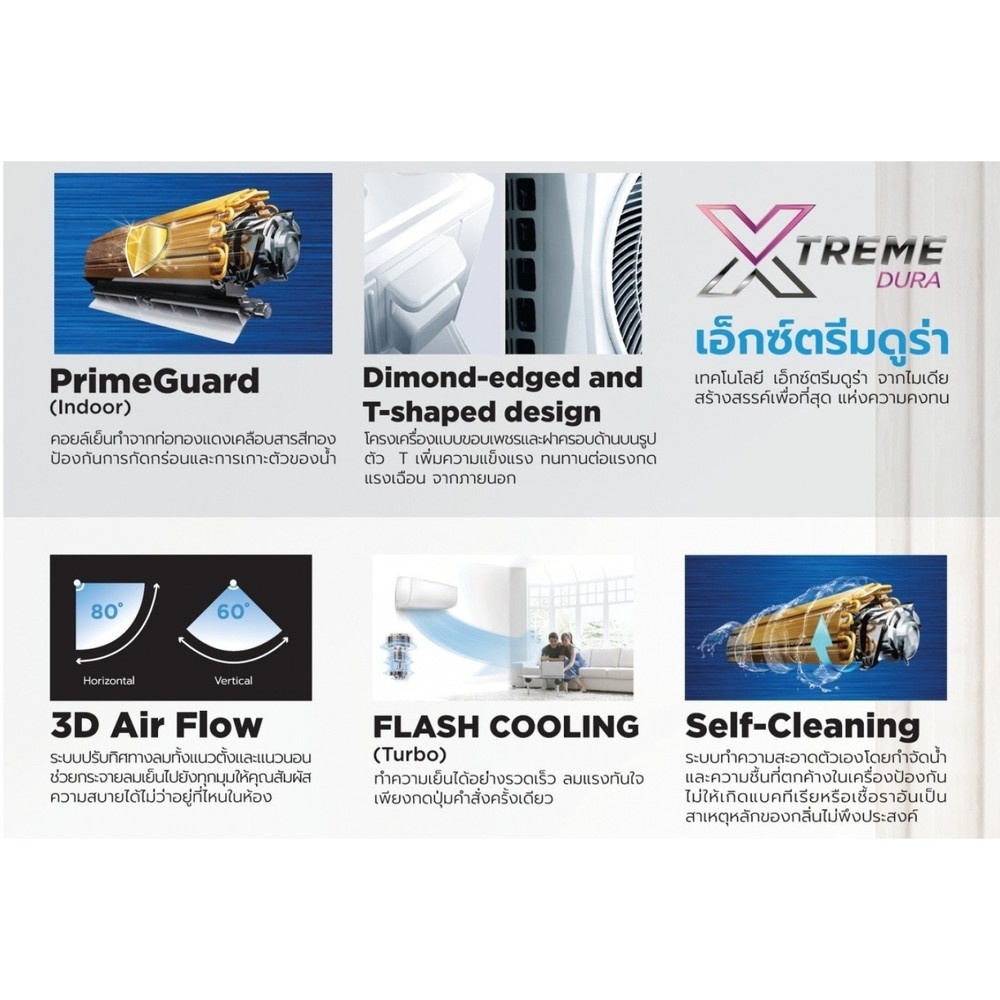 - 3D Air Flow ระบบปรับทิศทางลม ทั้งแนวตั้งและแนวนอน ช่วยกระจายลมเย็นไปยังทุุกมุุม ให้คุุณสัมผัส ความสบาย ไม่ว่าจะอยู่ที่่ไหนในห้อง