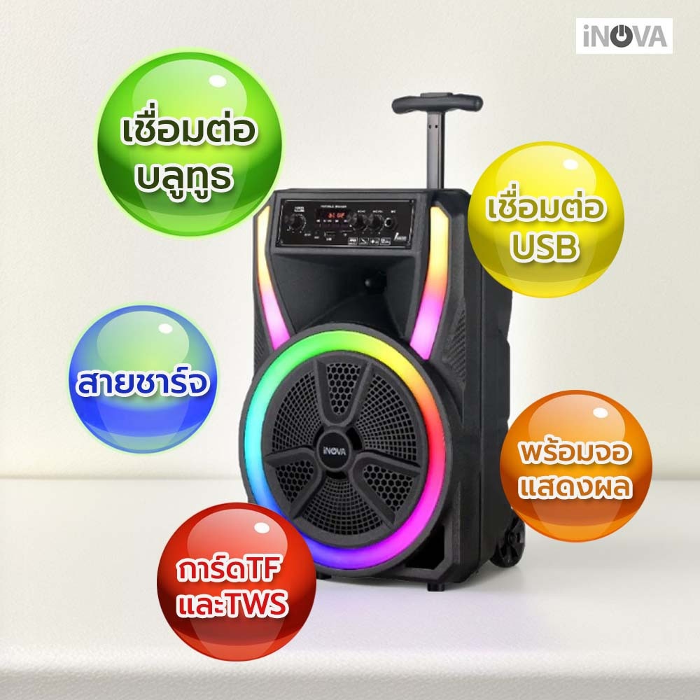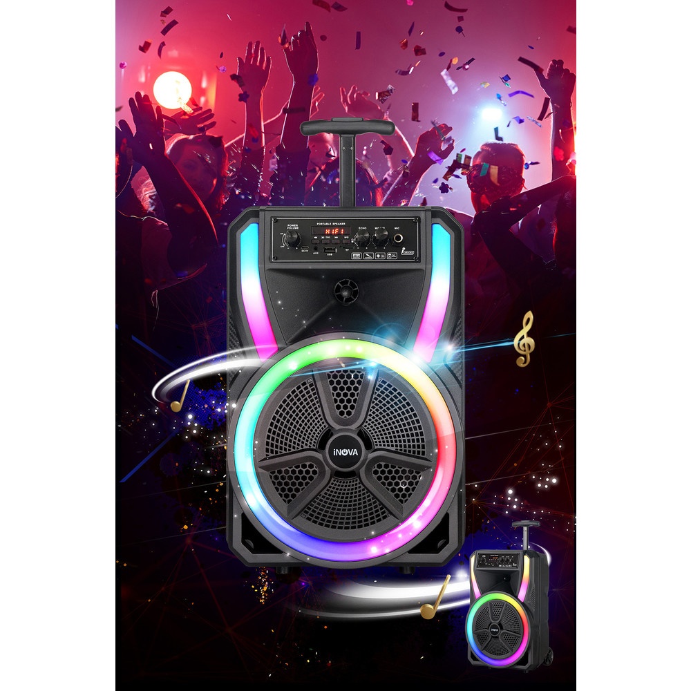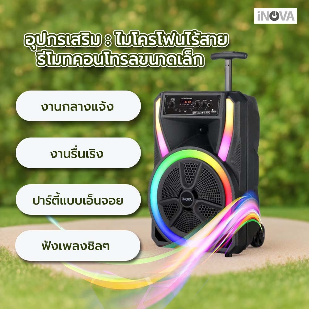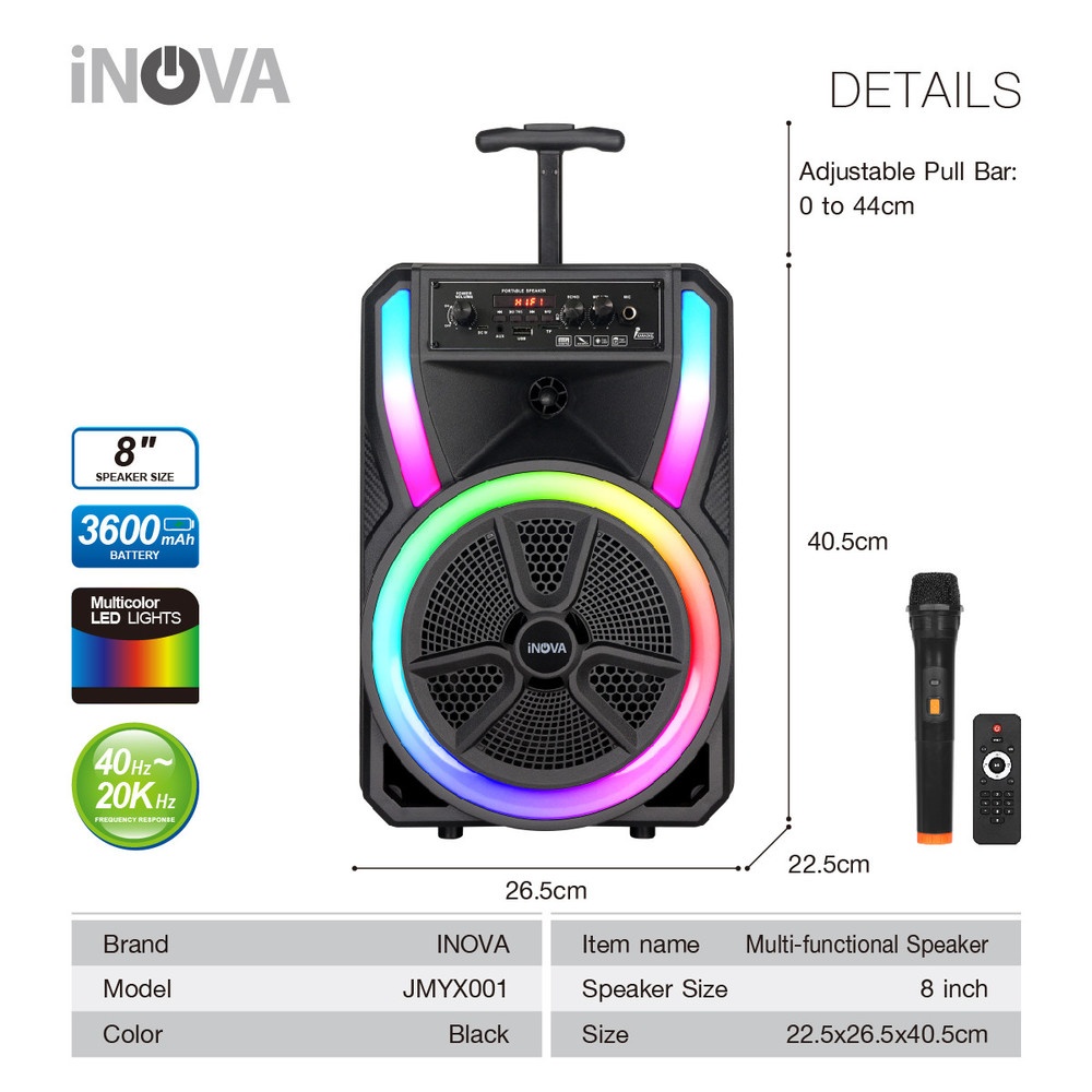 Inova ชุดลำโพงอเนกประสงค์ขนาด 8 นิ้ว รุ่น JMYX001 สีดำ ชุดลำโพงอเนกประสงค์ขนาด 8 นิ้ว ที่มาพร้อมกับไมโครโฟนไร้สายและรีโมทคอนโทรล ดีไซน์สวยงาม สีสันสดใส มาพร้อมกับแบตเตอรี่ลิเธียมขนาด 3600MAH และยังมีที่ดึงสำหรับเคลื่อนย้ายได้สะดวกสบาย เหมาะกับใช้สำหรับงานรื่นเริง งานกลางแจ้ง หรือใช้สำหรับงานขายนอกสถานที่ได้