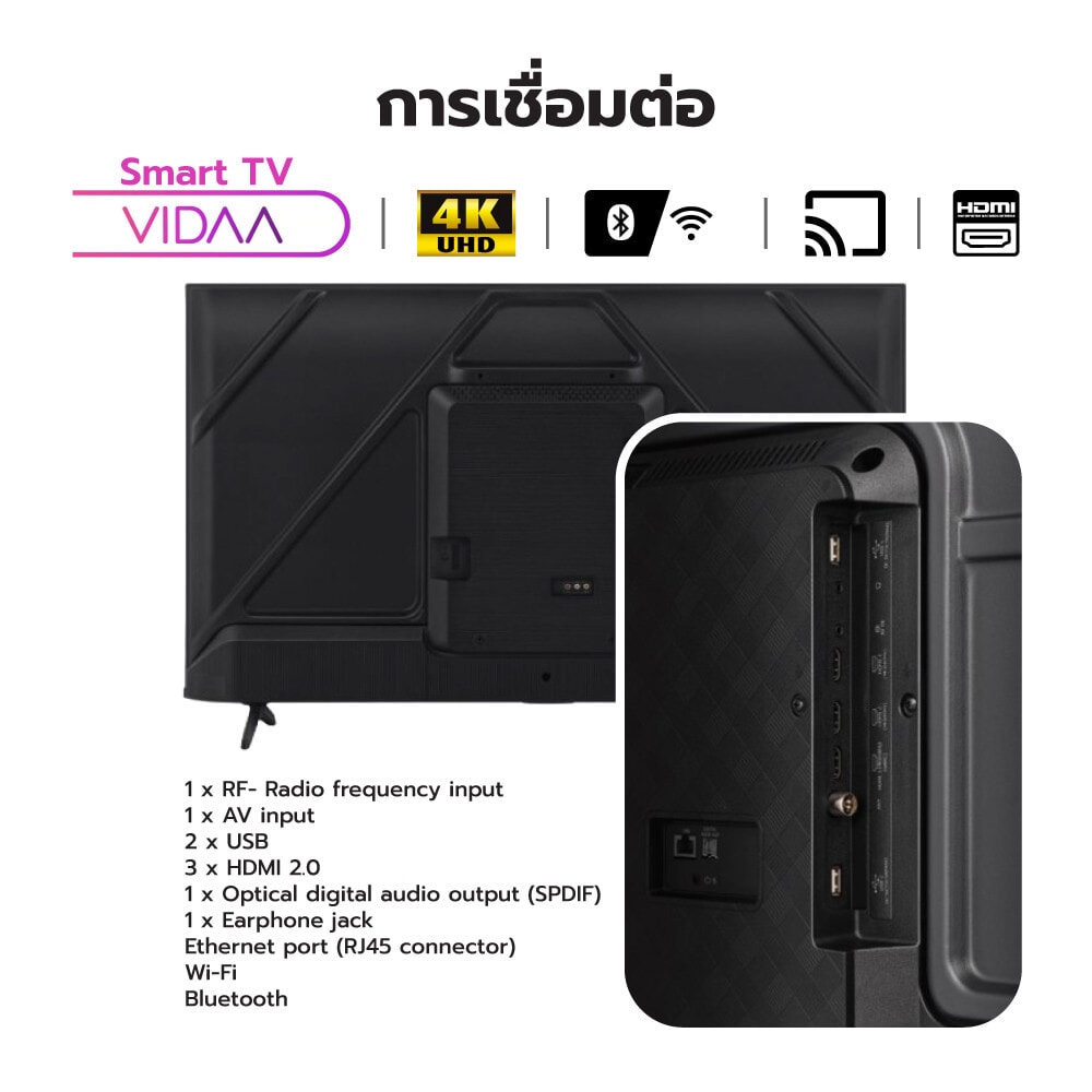 ความคมชัดระดับ 4K (3840X2160) UHD ภาพคมชัด สวย สดใส สมจริง / มาพร้อมแอปพลิเคชั่นหลากหลาย ด้วย VIDAA TV / จัดเต็มด้วย Dolby Vision & Dolby Digital DTS Virtual X / Smooth Motion และ Adaptive Depth ช่วยทำให้ทีวีสามารถแสดงภาพได้ดูมีมิติมากยิ่งขึ้น / Bezelless Design ให้ขอบจอบางลงเพื่อให้โฟกัสคอนเทนต์ได้อย่างไม่หยุดชะงัก/ รับชมหนังหรือซีรี่ย์เรื่องโปรดได้เต็มอรรถรสจากต้นฉบับ ด้วย Filmmaker Mode /ดูชัดทุกมุมมอง ด้วยมุมมองการรับชมที่กว้างถึง 178 องศา/ Bluetooth 5.3 / Wi-Fi bands 2.4-5GHz