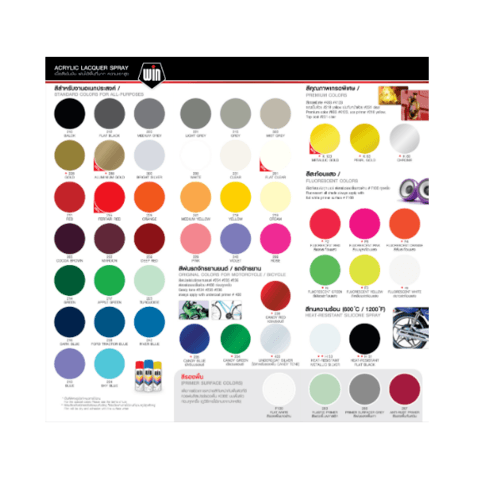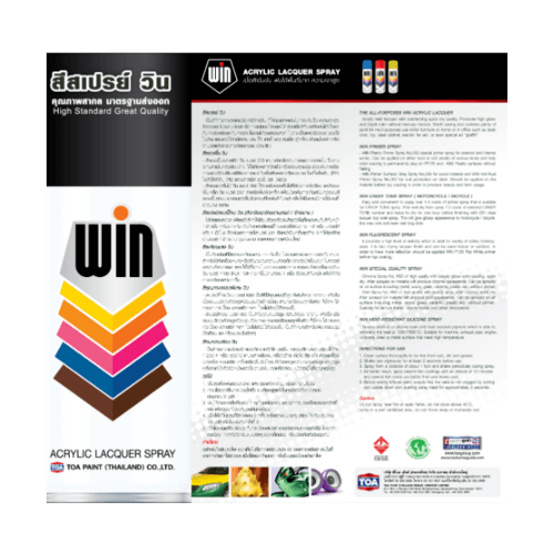 สีสเปรย์เอนกประสงค์ที่มีคุภาพสูง แห้งเร็ว สวยทน มีความเงางามสูง และยึดเกาะได้ดีบนทุกพื้นผิว สีสเปรย์ วิน เนื้อสีมาก ประหยัด คุ้มค่ากว่า เป็นสีที่ทำจากแลคเกอร์อะครีลิคเรซิ่น ที่ให้คุณภาพเด่นในการแห้งตัว ความเงาสูง สีสวยสดใส ยึดเกาะแน่นบนโลหะและไม้ ด้วยเนื้อสีที่มากจึงพ่นได้เนื้อที่มาก ประหยักและคุ้มค่ากว่า ใช้งานได้อเนกประสงค์ ไม่ว่าจะเป็นเฟอร์นิเจอร์ ของใช้ในบ้าน และของใช้สำนักงาน เช่นโต๊ะ เก้าอี้ ของเด็กเล่น ตู้เหล็ก พัดลมไฟฟ้า หรืองานตกแต่งลวดลายศิลปะ (Graffiti)