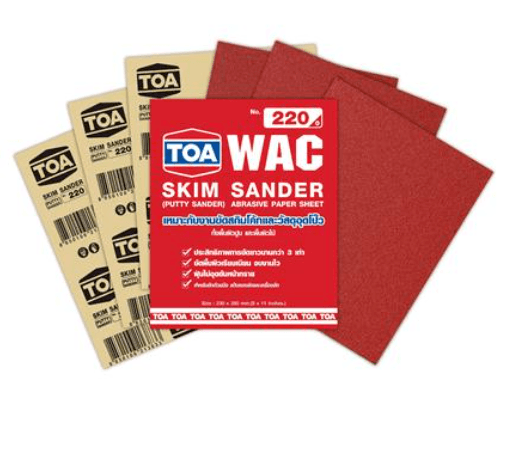 • TOA กระดาษทรายขัดสกิมโค้ท WAC กระดาษทรายขัดสกิมโค้ท มีประสิทธิภาพการขัดยาวนานกว่า 3 เท่า ขัดพื้นผิวเรียบเนียน จบงานไว และ ฝุ่นไม่อุดตันหน้าทราย เหมาะกับงานขัดสกิมโค้ทและวัสดุอุดโป๊ว