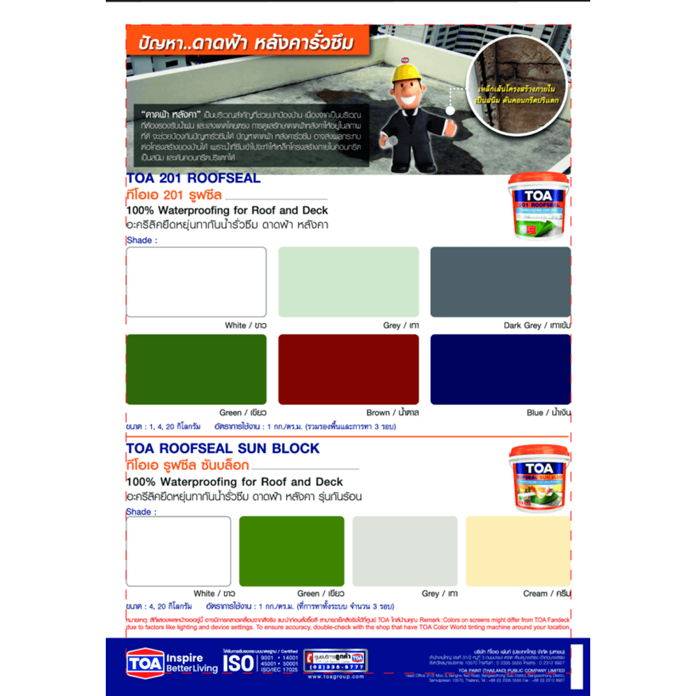 อะคริลิกทากันน้ำรั่วซึม 100% สำหรับดาดฟ้า หลังคา เป็นอะคริลิกชนิดยืดหยุ่นคุณภาพสูง ใช้สำหรับทาเคลือบพื้นผิวเพื่อป้องกันการรั่วซึมจากรอยแตกร้าวของคอนกรีตบริเวณต่างๆ เช่น ดาดฟ้า กระเบื้องมุงหลังคาทุกชนิด ระเบียง รางระบายน้ำคอนกรีต ฯลฯ