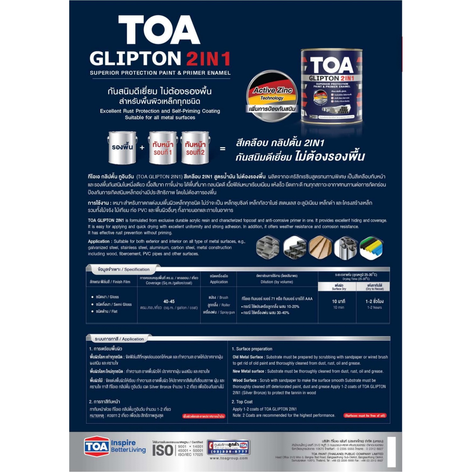 · ด้วย Active Zinc Technology จากเยอรมนี เพิ่มประสิทธิภาพการป้องกันสนิมให้เหนือกว่าสีน้ำมัน 2IN1 ทั่วไปมากกว่า 2 เท่า