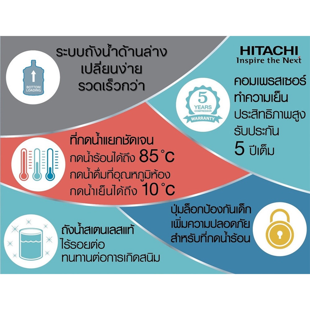 ให้คุณสะดวกสบายในการดื่มน้ำ และชงเครื่องดื่มด้วยเครื่องทำน้ำร้อนน้ำเย็นในตัวเดียว ดีไซน์โฉมใหม่ โค้งมน ทันสมัย เหมาะกับทุกสถานที่, ระบบป้องกันไม่ให้ความร้อนมีระดับสูงเกินไป คอมเพรสเซอร์ทำความเย็นได้รวดเร็ว
