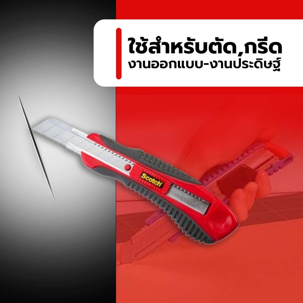 ใบมีดทำจากสแตนเลสคุณภาพ ระบบออโต้ล็อค ช่วยล็อคใบมีดในระดับที่ต้องการใช้งานได้อัตโนมัติ น้ำหนักเบา พกพาสะดวก ใช้กรีดวัสดุต่างๆ เช่น พลาสติก สติ๊กเกอร์ กระดาษ เชือก