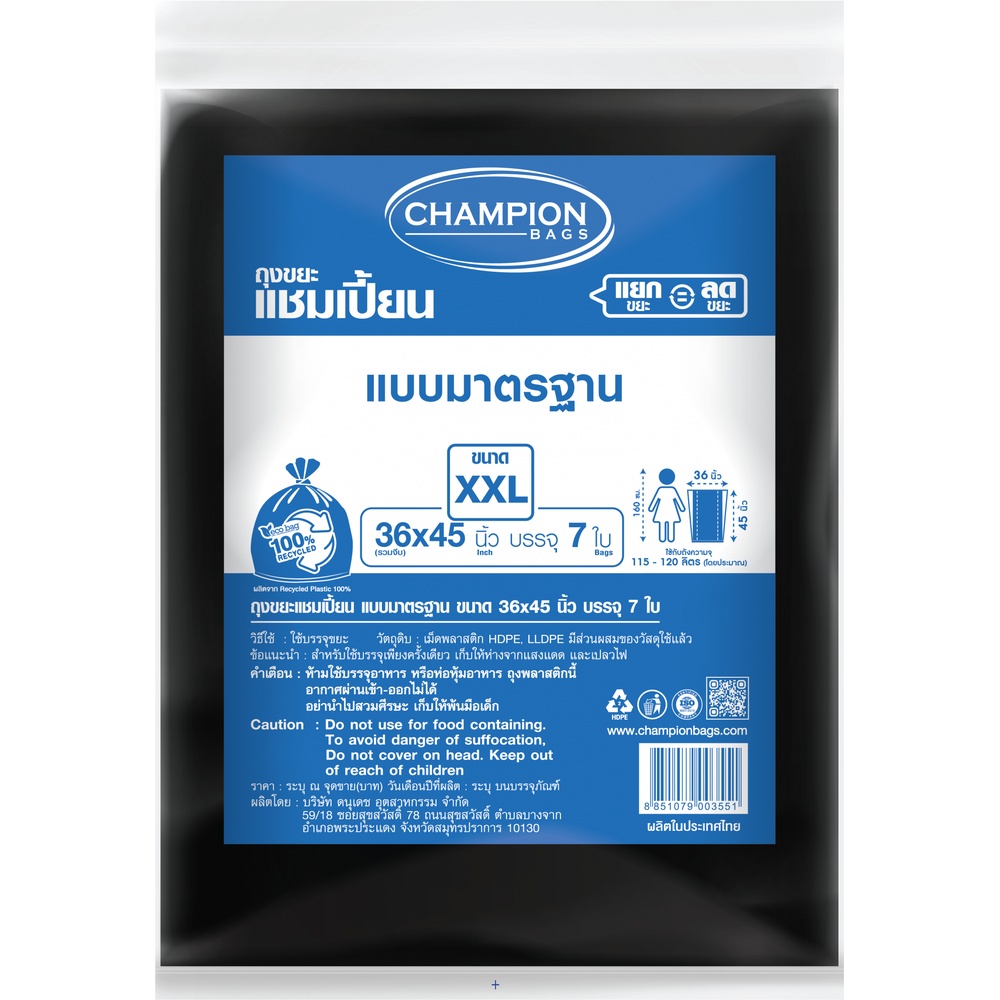 ถุงขยะแชมเปี้ยนแบบมาตรฐาน สีดำ คุณภาพมาตรฐาน รับน้ำหนักได้ มาก ขนาดเหมาะใช้ในครัวเรือน ร้านค้า ผลิตจากวัสดุรีไซเคิล