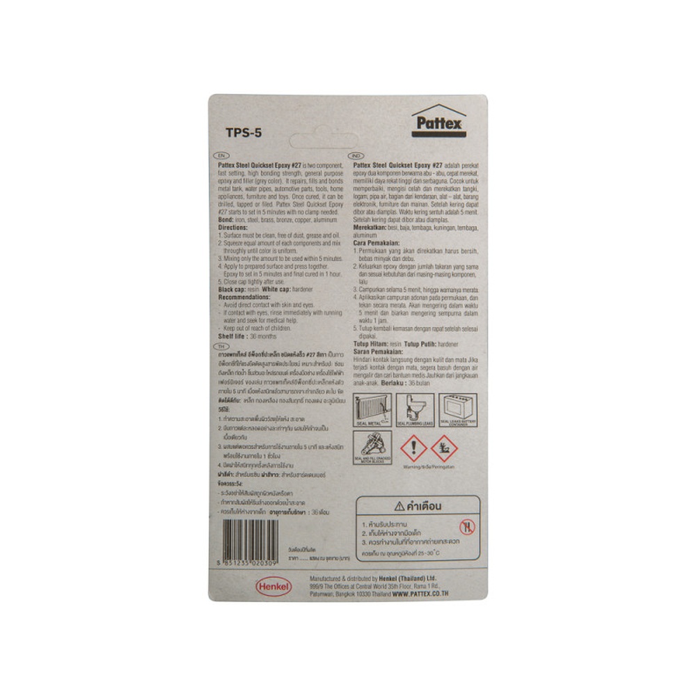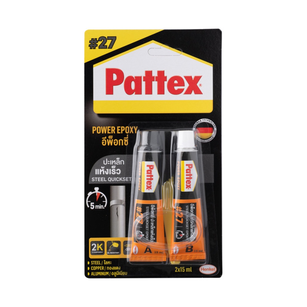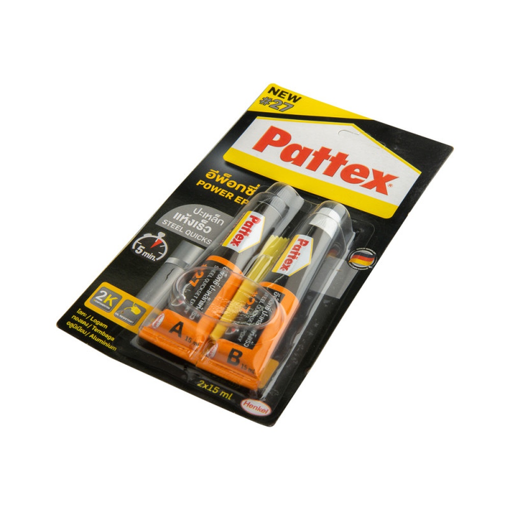 เป็นกาวอีพ็อกซี่ที่ให้แรงยึดติดสูง สารพัดประโยชน์ เหมาะสําหรับปะ ซ่อม ถังเหล็ก ท่อน้ํา ชิ้นส่วนอะไหล่รถยนต์ เครื่องมือช่าง เครื่องใช้ไฟฟ้า เฟอร์นิเจอร์ ของเล่น กาวแพทเท็คส์อีพ็อกซี่ปะเหล็ก แห้งตัว ภายใน 5 นาที เมื่อแห้งสนิทแล้วจะเป็นสีเทา สามารถเจาะ ทําเกลียว ตะไบ ขัด