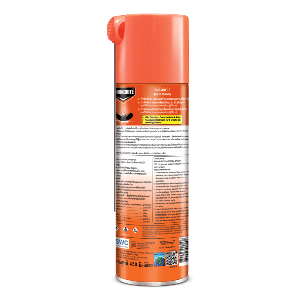ใส่หัวฉีดที่มีหลอดก้านยาวเข้ากับวาล์วบนกระป๋อง เขย่ากระป๋องแล้วฉีด เชนไดร้ท์ 1 โดยจ่อปลายก้านหลอดเข้าไปในบริเวณรูที่แมลงเจาะไว้ ตามซอกมุม ใต้ตู้ รอบถังขยะ ขอบประตู หน้าต่าง รอยแตก ตามทางที่แมลงเดินผ่านหรือชอบอยู่หรือใช้ฉีดให้ถูกตัวแมลงจะได้ผลดียิ่งขึ้น