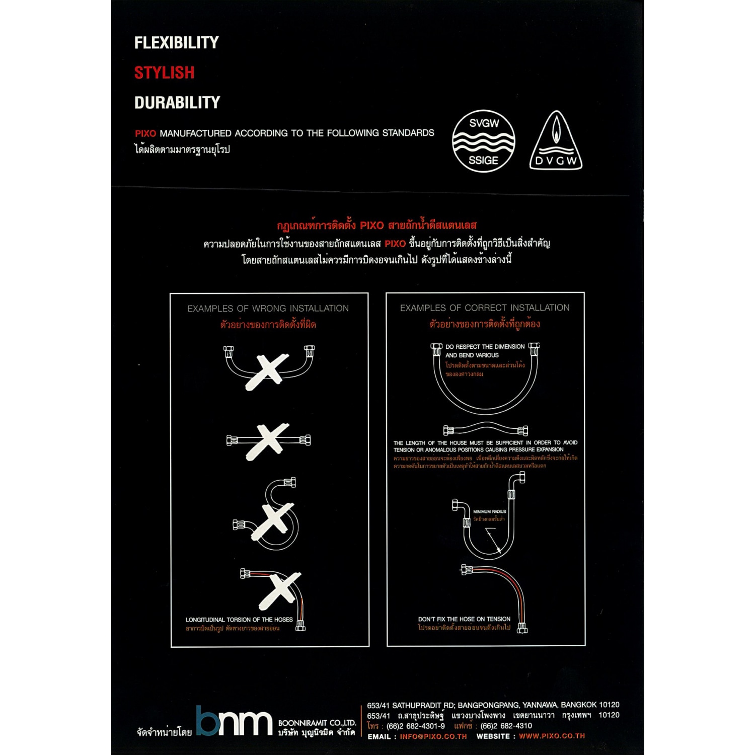 - ควรเลือกใช้สายถักฯให้เหมาะสมกับอุณหภูมิน้ำ - ไม่เป็นสนิม ทนทาน ทำจากสแตนเลสเกรดพิเศษ