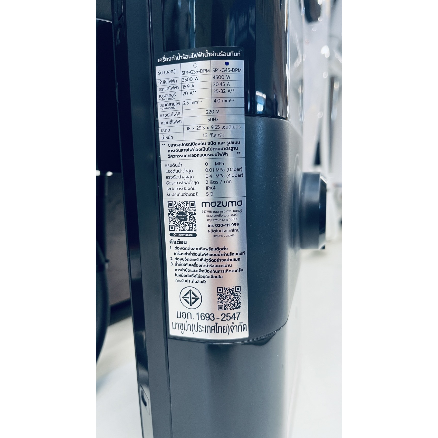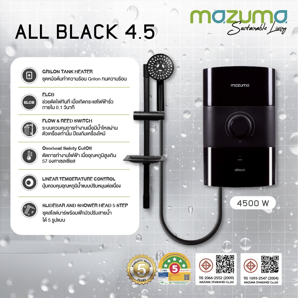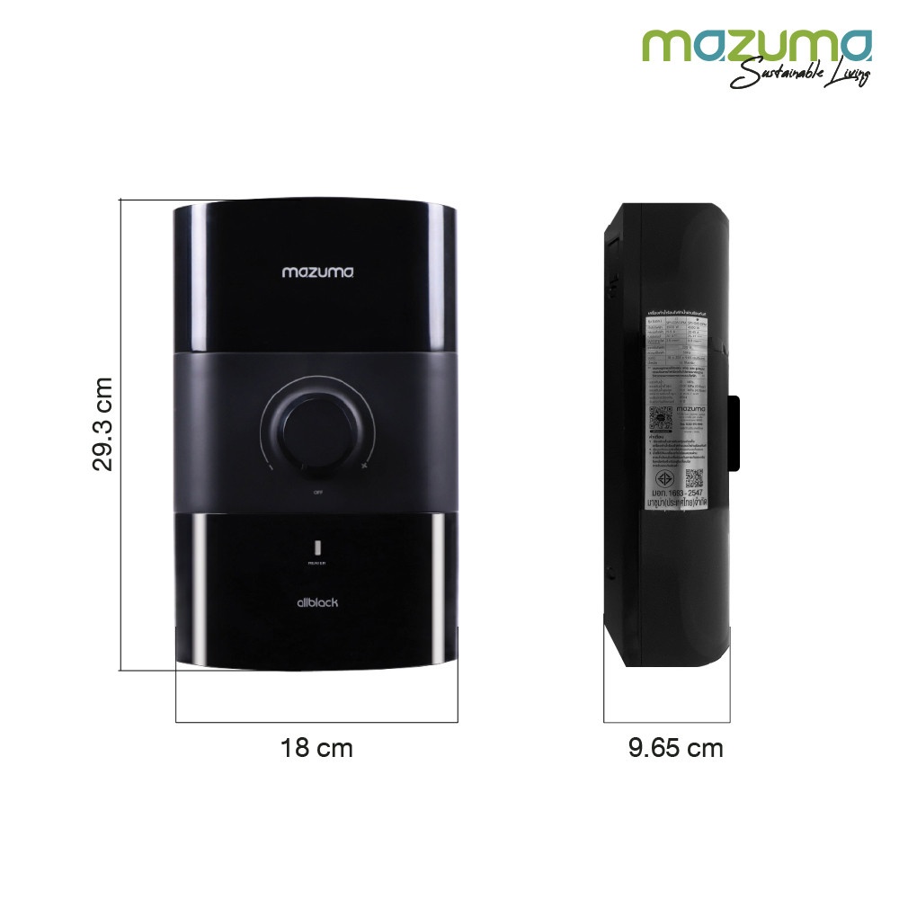 ตัวเครื่องออกแบบ รูปทรงทันสมัย ใช้พื้นที่ติดตั้งน้อย รองรับมาตรฐานผลิตภัณฑ์อุตสาหกรรม เครื่องทำน้ำอุ่น MAZUMA (มาซูม่า) สามารถทำน้ำร้อนได้อย่างรวดเร็วและปลอดภัย ไร้สนิม มาพร้อมระบบตัดไฟอัตโนมัติติดตั้งอยู่ภายในตัวเครื่อง ซึ่งสามารถที่จะตัดไฟภายใน 0.1 วินาที เมื่อเกิดไฟฟ้ารั่วดังนั้นจึงมั่นใจทุกครั่งว่าจะไม่เกิดปัญหากระแสไฟฟ้ารั่วไปทำอันตรายกับคุณและคนที่คุณรัก เหมาะสำหรับการใช้งานในโรงแรม ห้องพัก หรือบ้านที่อยู่อาศัยทั่วไป