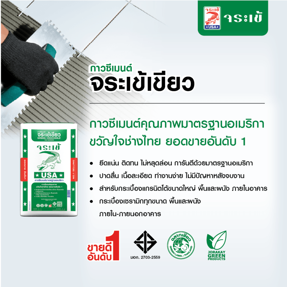 กาวซีเมนต์จระเข้เขียว ประกอบด้วยปูนซีเมนต์ปอร์ตแลนด์ ทรายละเอียดคัดพิเศษ และวัสดุผสมพิเศษอื่น ๆ ทำให้ผลิตภัณฑ์มีคุณสมบัติที่ให้การยึดเกาะสูง กาวซีเมนต์จระเข้เขียวใช้สำหรับงานปูกระเบื้องเซรามิกทั่วไป กระเบื้องดูดซึมน้ำต่ำ ใช้ได้ทั้งพื้นและผนังภายในอาคาร โดยไม่ต้องแช่กระเบื้องในน้ำก่อนปู