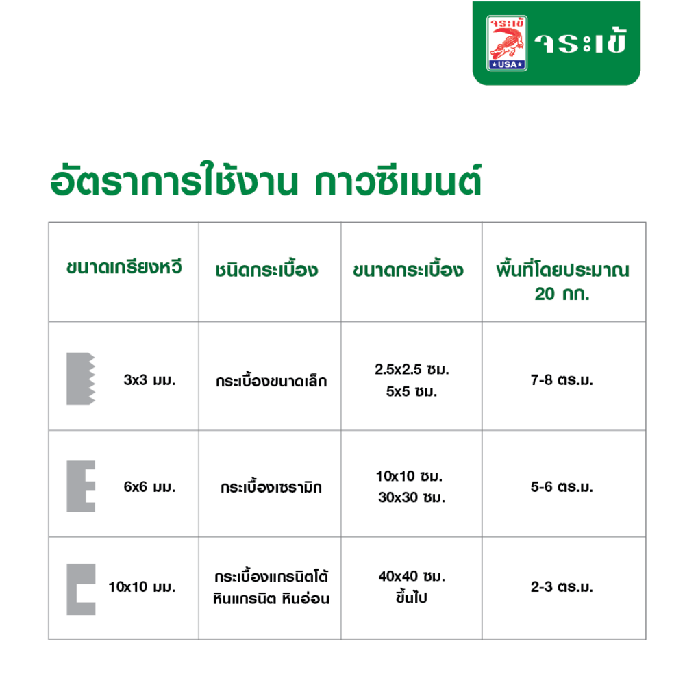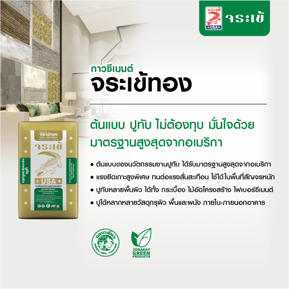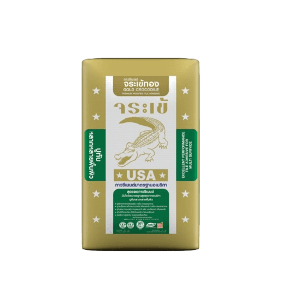 กาวซีเมนต์ จระเข้ทอง มีผงลาเท็กซ์ที่เพิ่มประสิทธิภาพของกาวซีเมนต์ให้ดีขึ้น มีส่วนผสมของปูนซีเมนต์ปอร์ตแลนด์ ทราย และเคมีผสมเพิ่มชนิดพิเศษอื่นๆ ทำให้ผลิตภัณฑ์มีคุณสมบัติที่ให้การยืดเกาะสูง มีการยืดหยุ่นที่ดี ทนทานในทุกสภาพภูมิอากาศ เหมาะสำหรับใช้ปูภายนอกอาคารโดยเฉพาะ ใช้ปูกระเบื้องเซรามิกทุกชนิด ปูหินอ่อน ปูแกรนิต ปูโมเสคแก้ว กระเบื้องแก้ว และใช้ปูทับกระเบื้องเดิม โดยไม่ต้องสกัดของเก่า ทั้งพื้นและผนังภายใน รวมทั้งสามารถใช้ปูบนพื้นผิวไม้อัดโครงสร้าง แผ่นไฟเบอร์ซีเมนต์